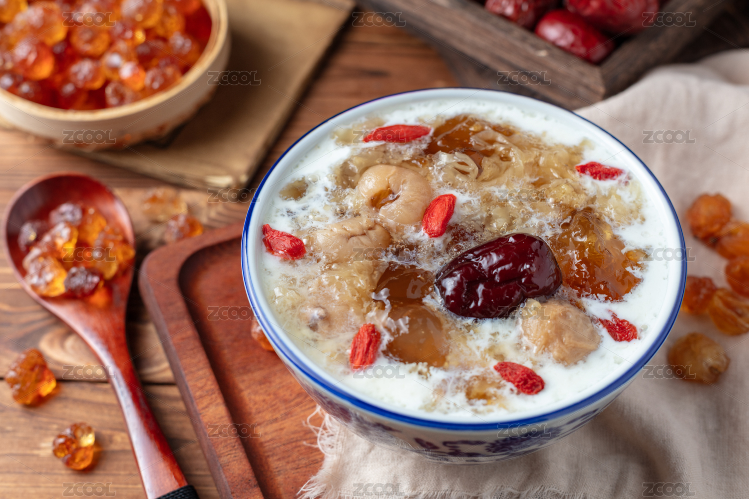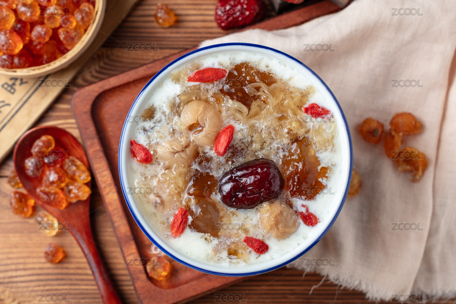 俯拍中式是木纹桌子上的红枣银耳莲子羹