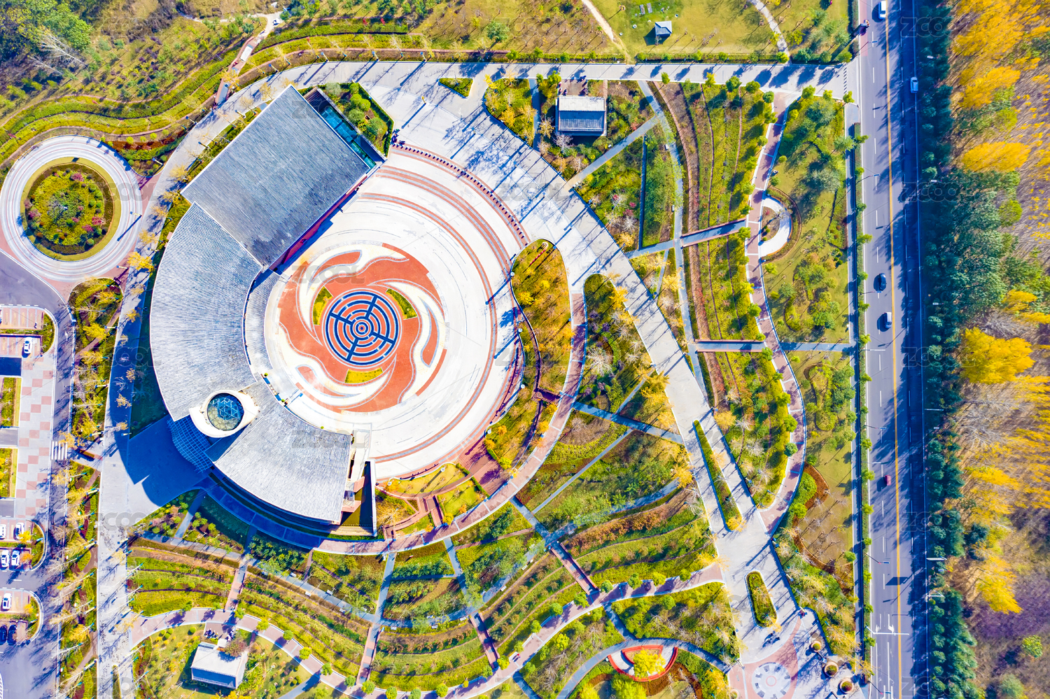 无人机垂直角度拍摄的柳州市会展中心的象征胚芽的建筑楼顶外形