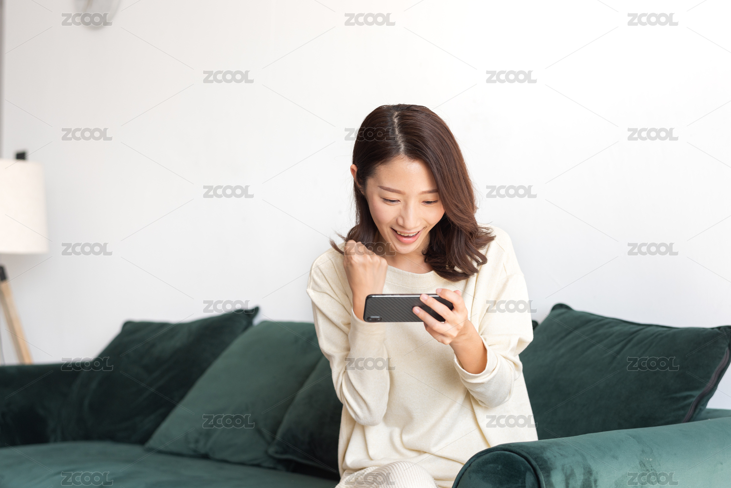 年轻女士在客厅使用智能手机玩游戏