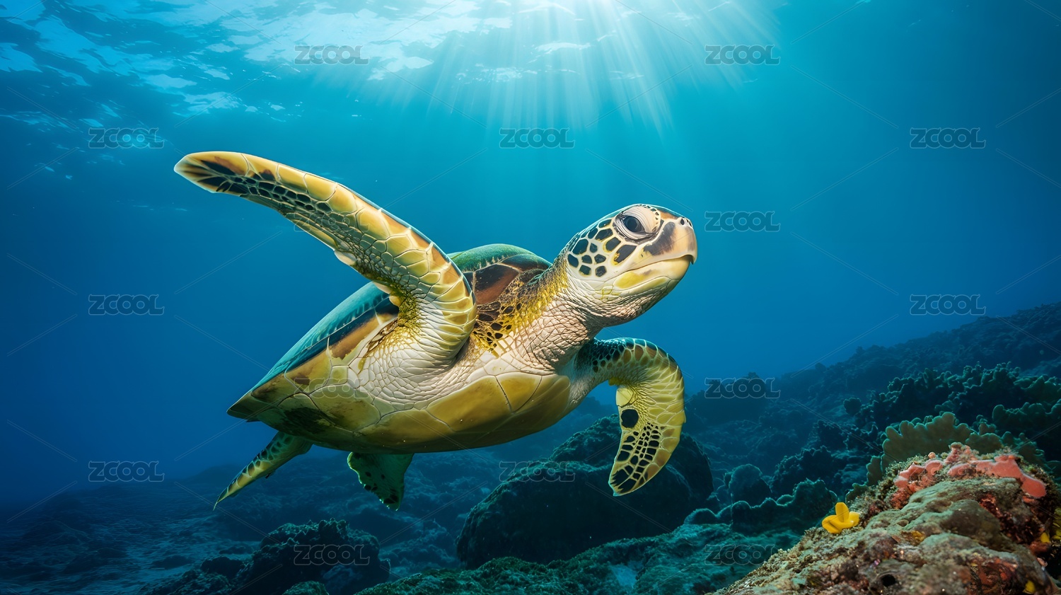 阳光照耀下的海龟在海底珊瑚礁中畅游
