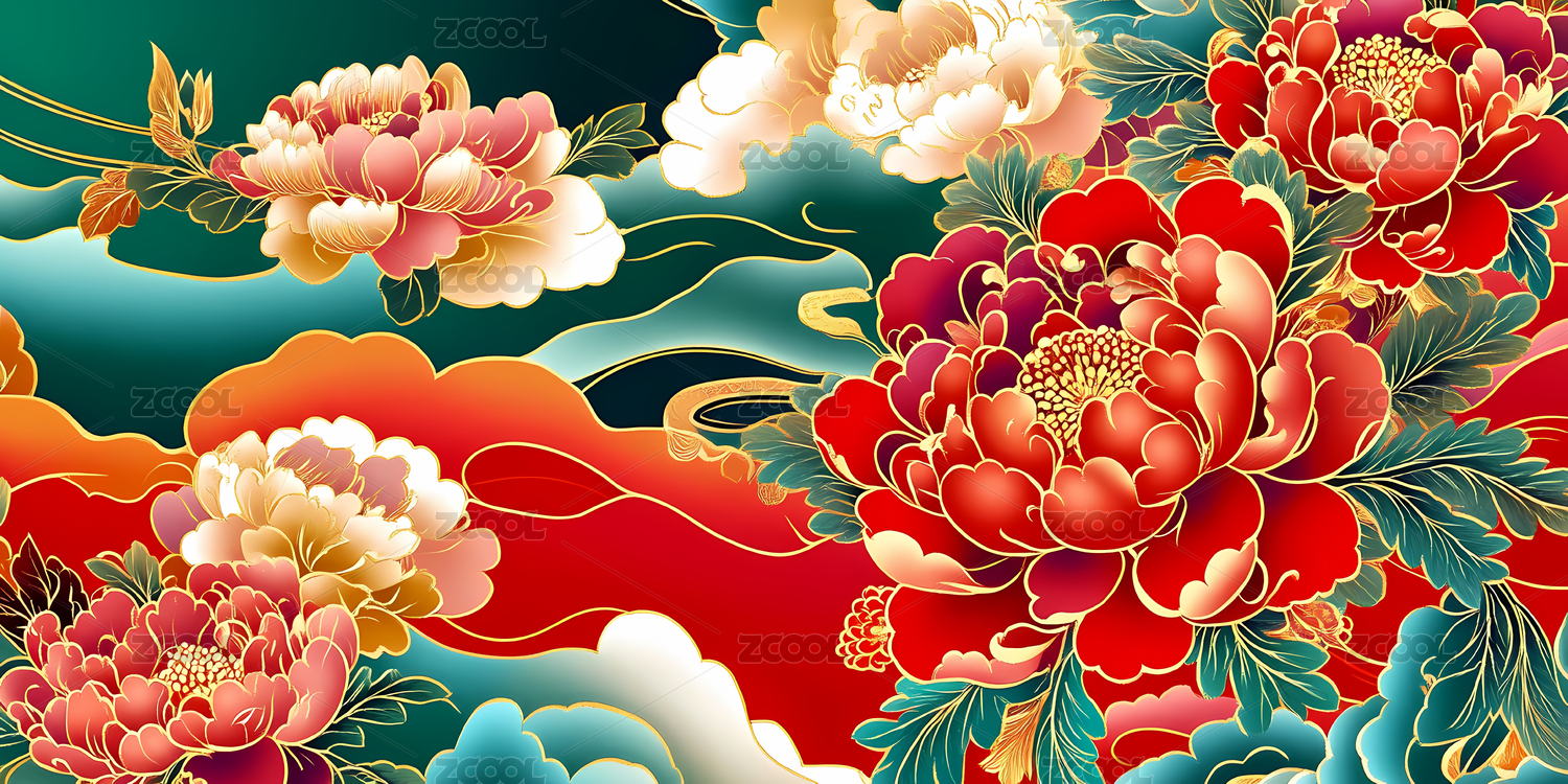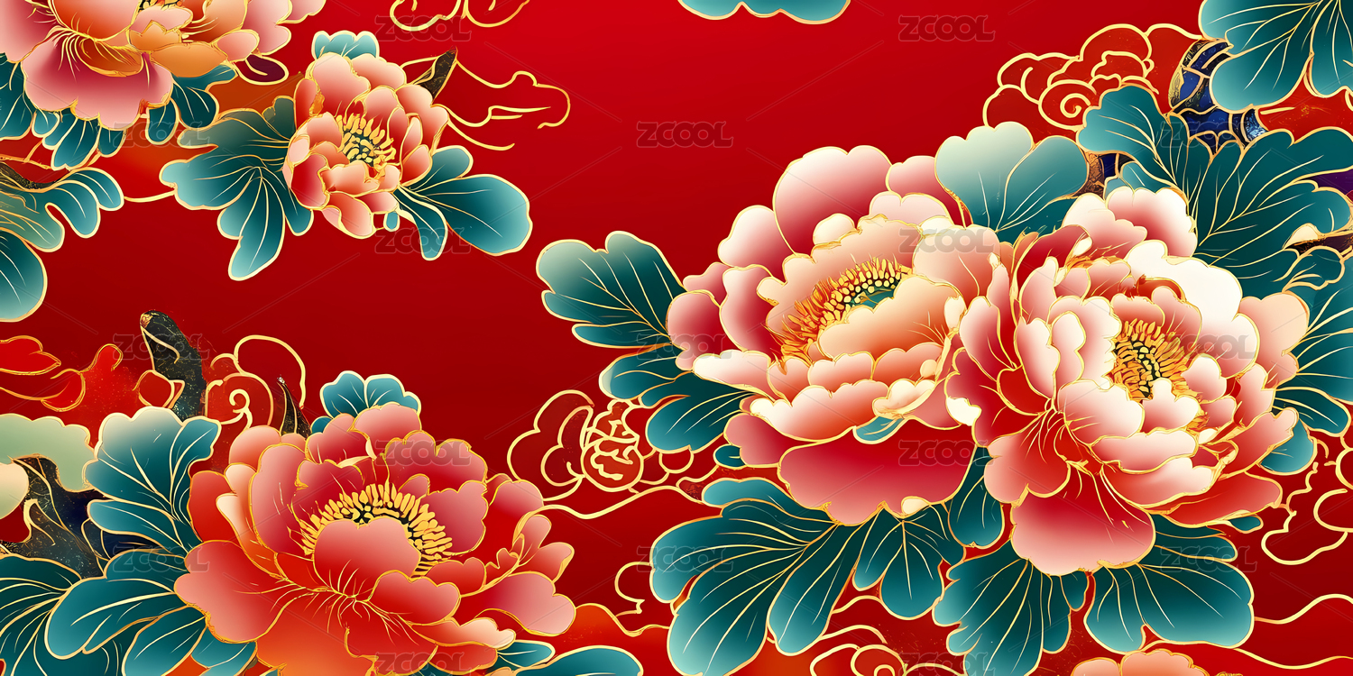 背景,插画,国潮,花,叶子,传统,华丽的,牡丹,庆祝,红色