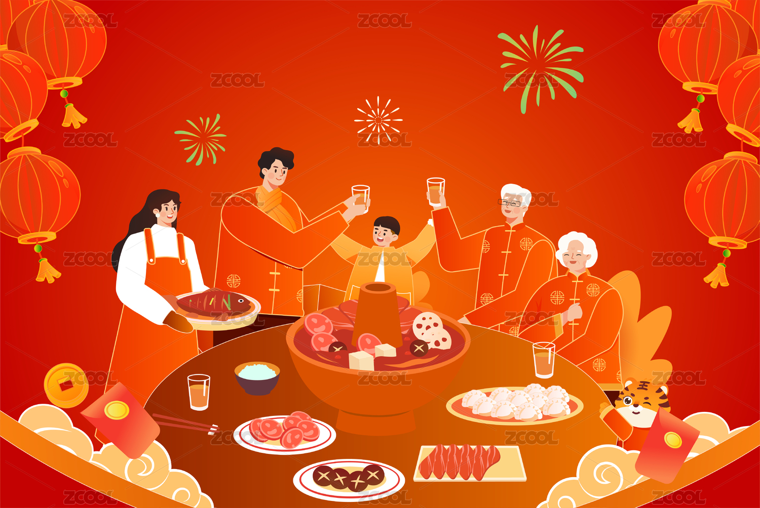 HEZODIAC2021,卡通,扁平风,牛年,2021,过年,新春,年夜饭,团圆饭,中国风