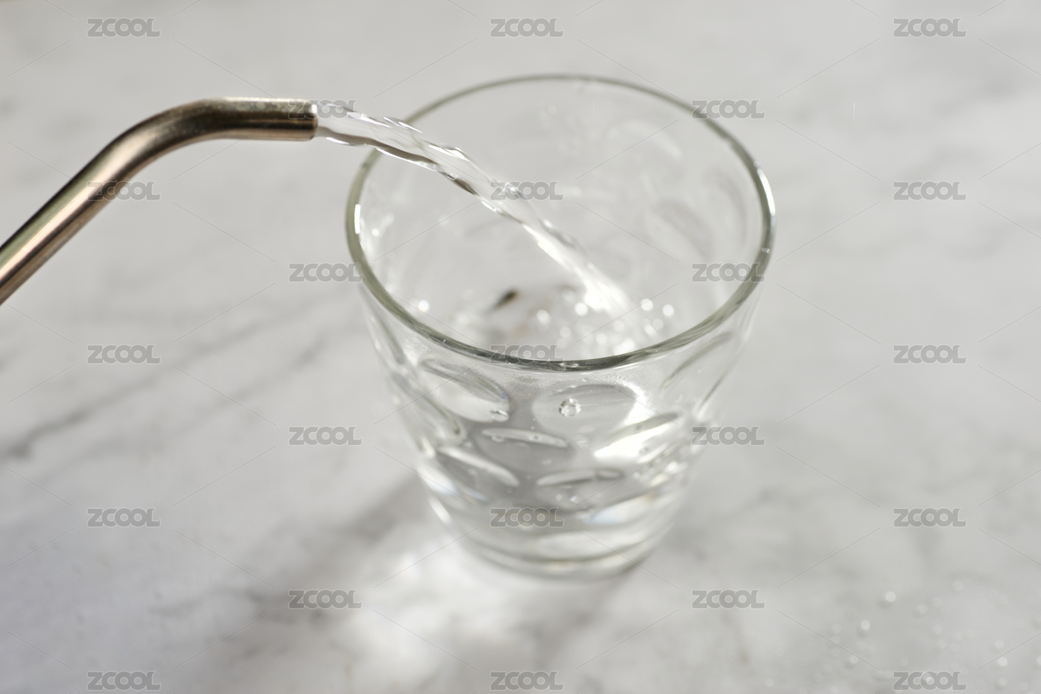 取水器的不锈钢水嘴向玻璃杯注入净水