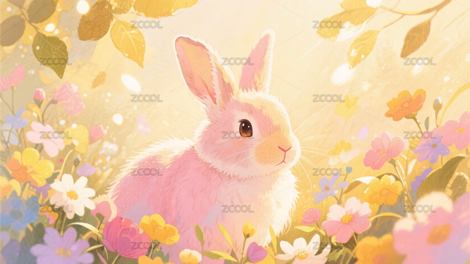 花丛中的粉色可爱兔子