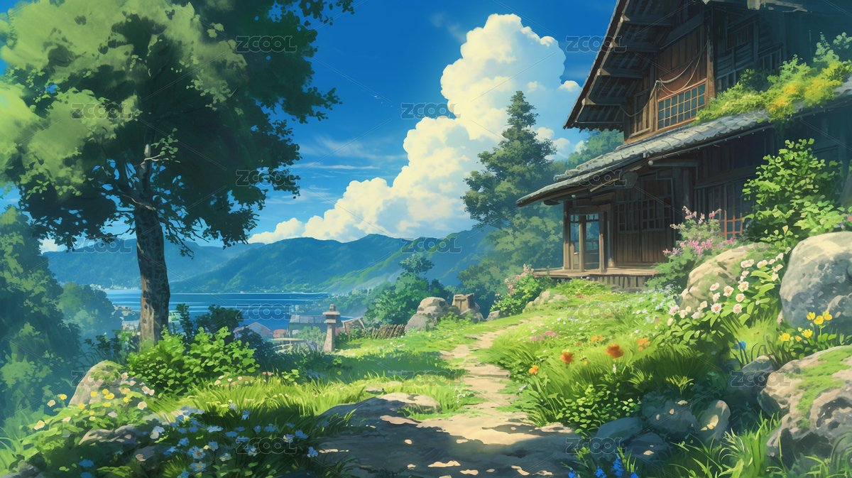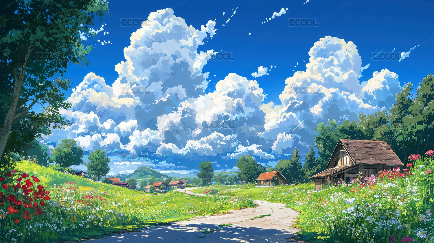 治愈系童话绘本风格郊外绿色的风景壁纸