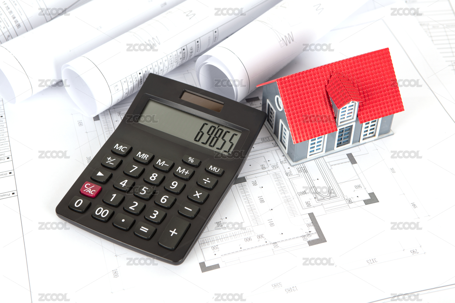 施工平面图纸上的房子模型和计算器