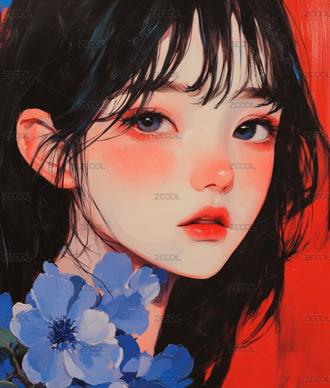蓝色花朵下的少女红背景唯美悲伤插画油画