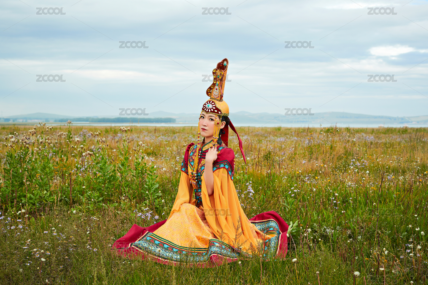 草原上身穿豪华蒙古族服饰的蒙族少女