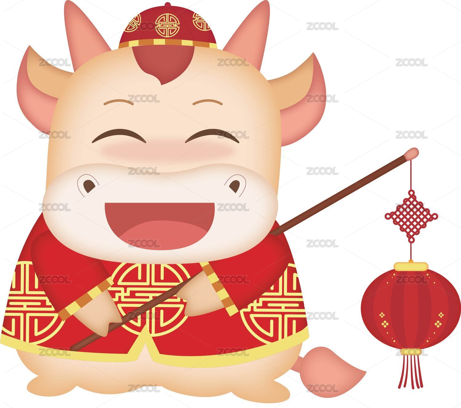 国潮风卡通生肖牛持灯笼踏祥云牛年插画