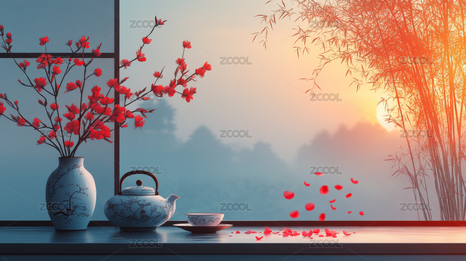 中国风,喝茶,茶具,茶杯,梅花,竹叶,竹子,蓝色,写意,意境