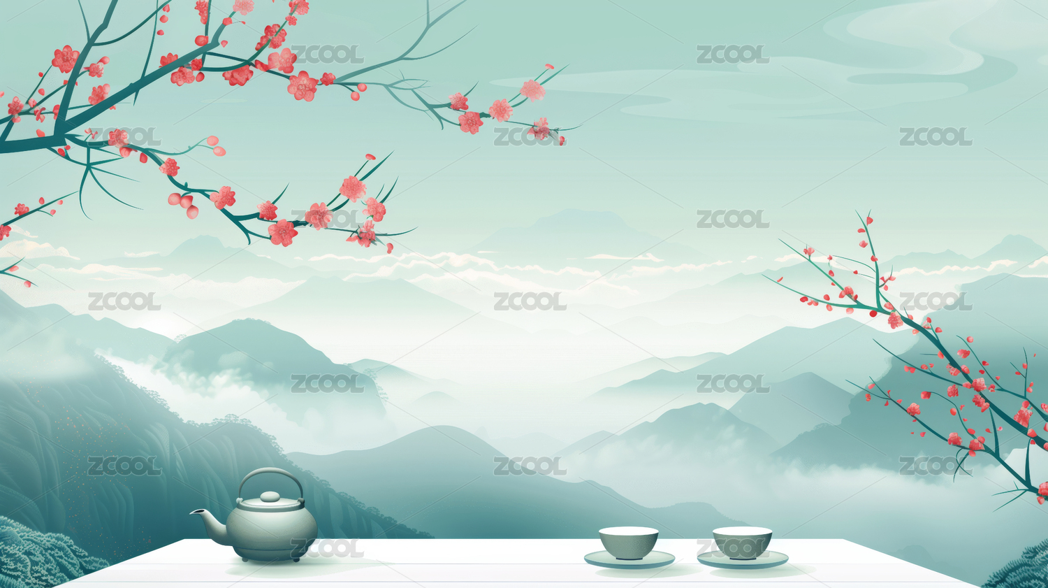 新中式茶壶和茶杯山峰风景插画