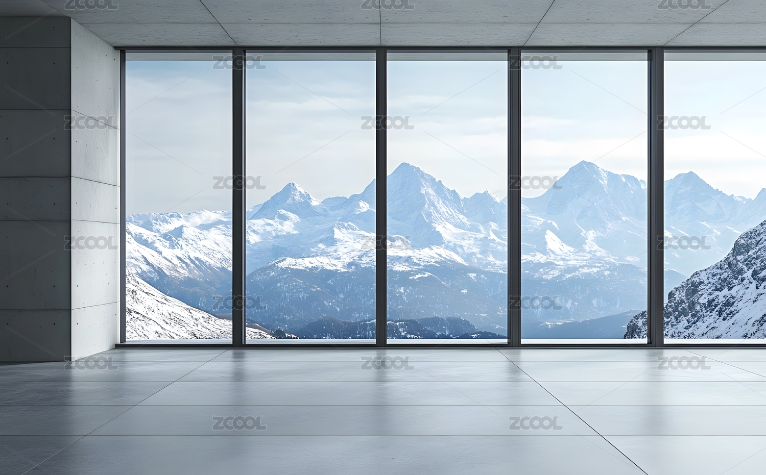 现代建筑空间与窗外的雪山