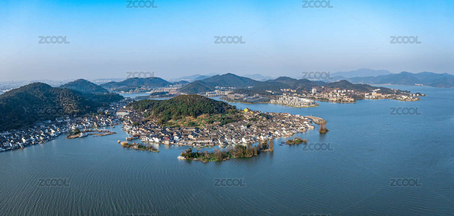 中国浙江省宁波市东钱湖小普陀景区航拍图