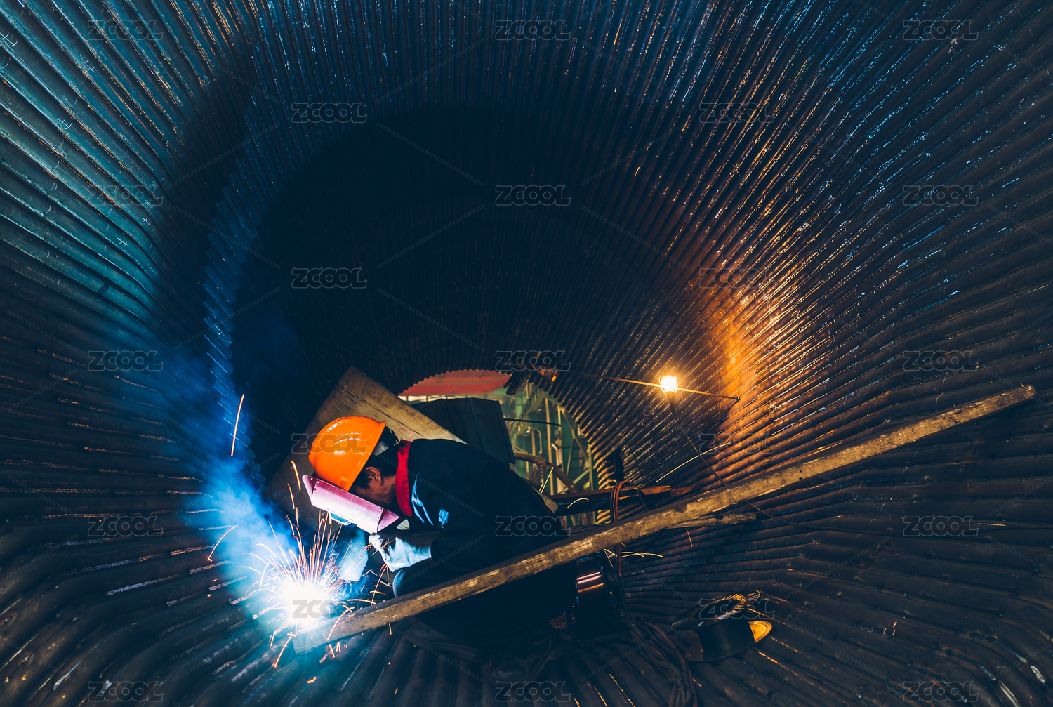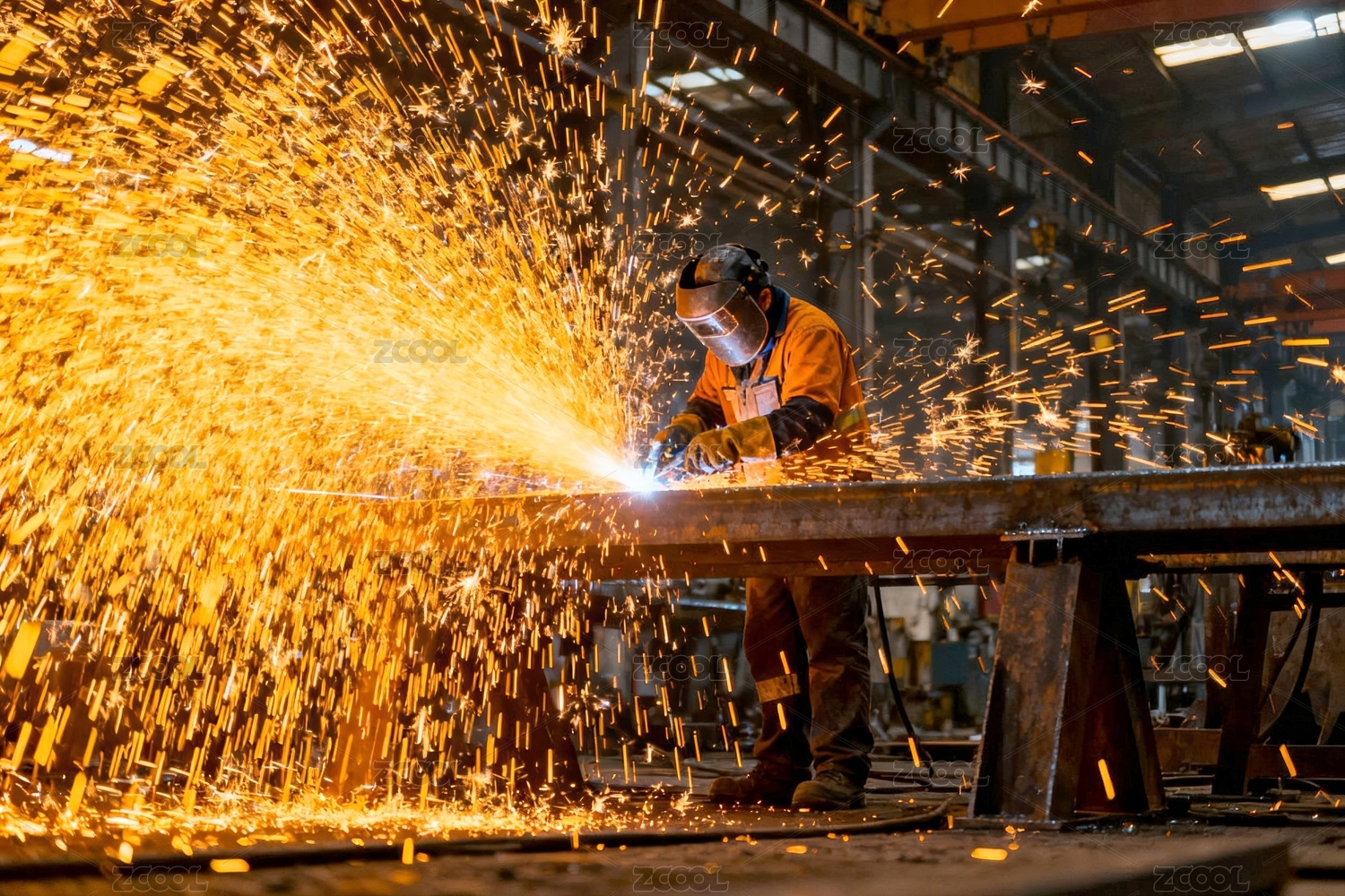 昏暗的工厂里工人正在焊接铁框,喷射火花