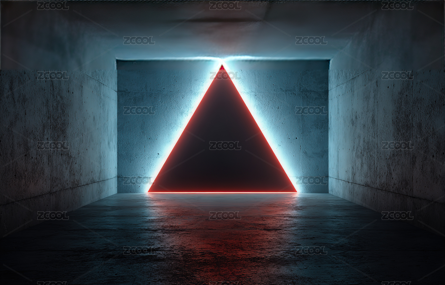 红色霓虹三角形在黑暗走廊中发光