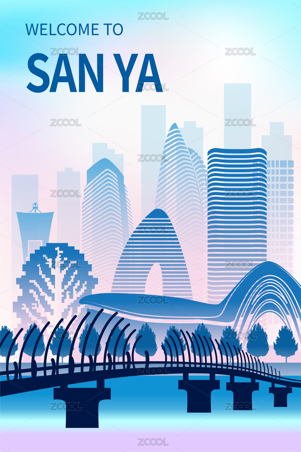 中国海南省三亚市城市天际线矢量插画蓝色