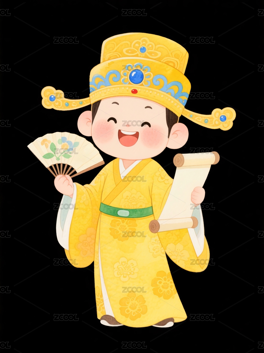 卡通古装官员手持扇子卷轴