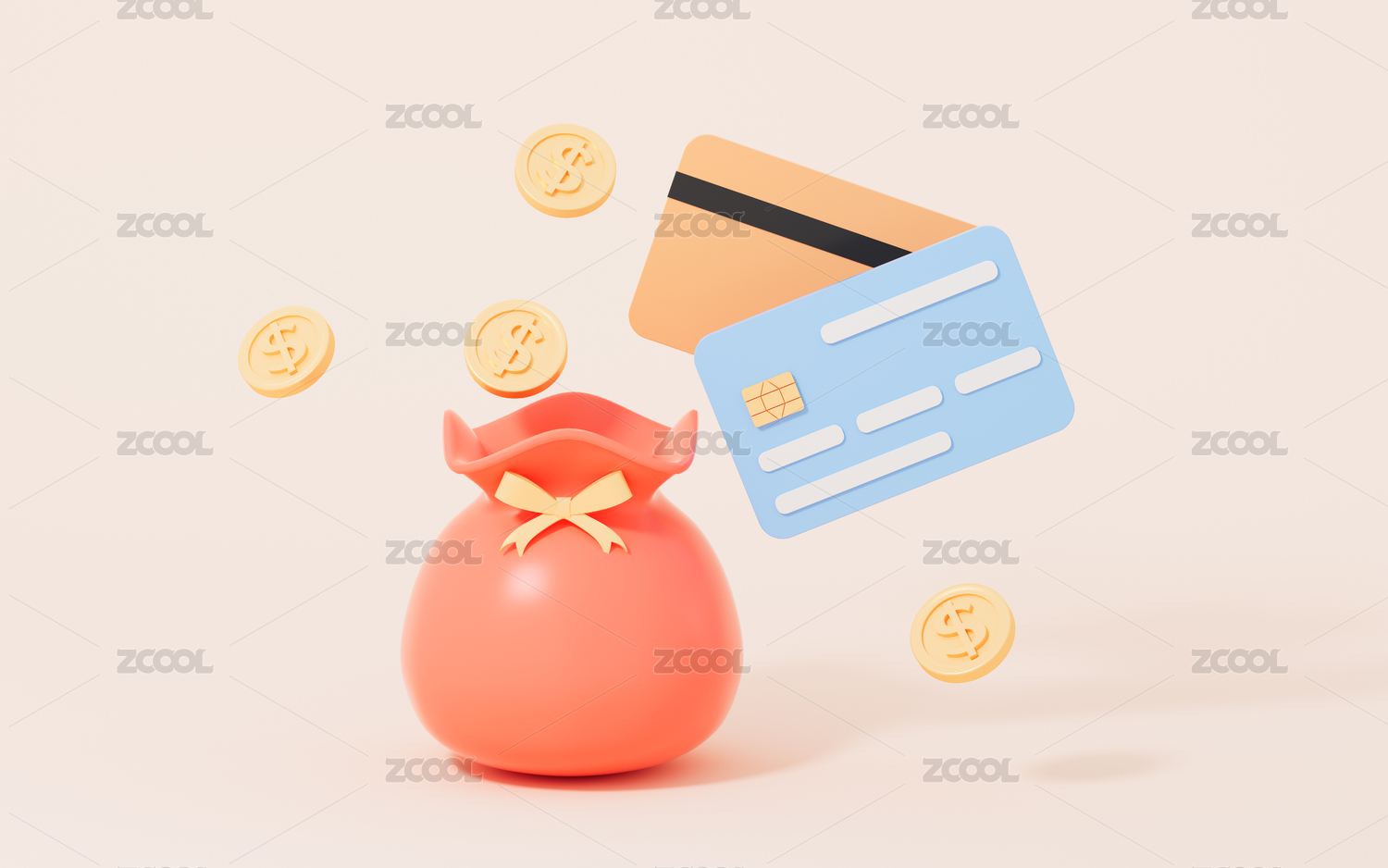 银行卡与钱袋3D渲染