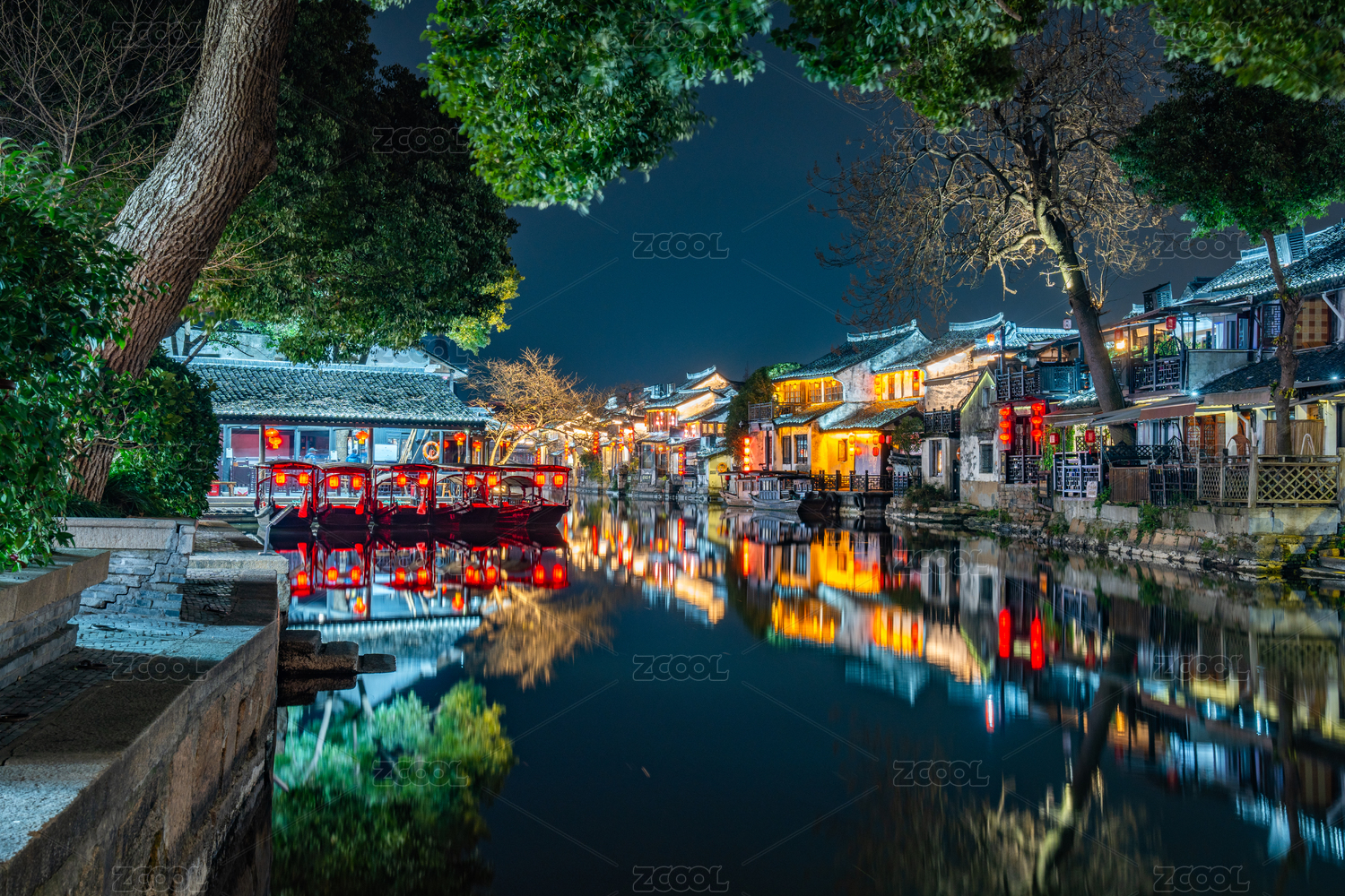 中国江苏省苏州市山塘街(中国历史文化名街)传统水乡之夜景。
