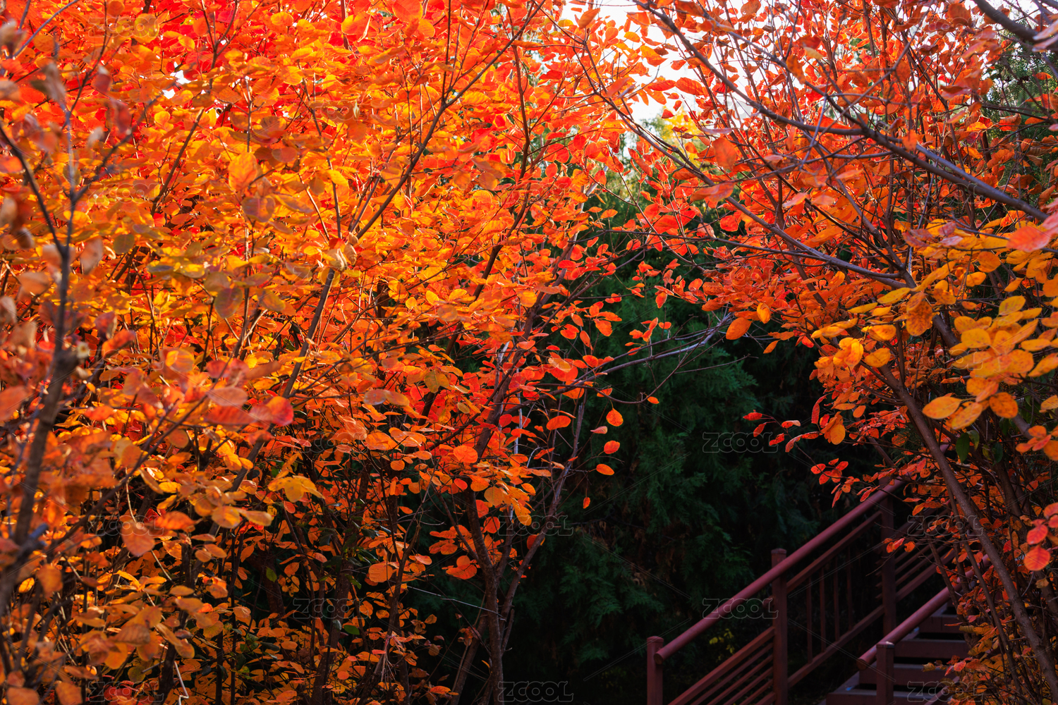 木质栈桥上飘落的红色枫叶