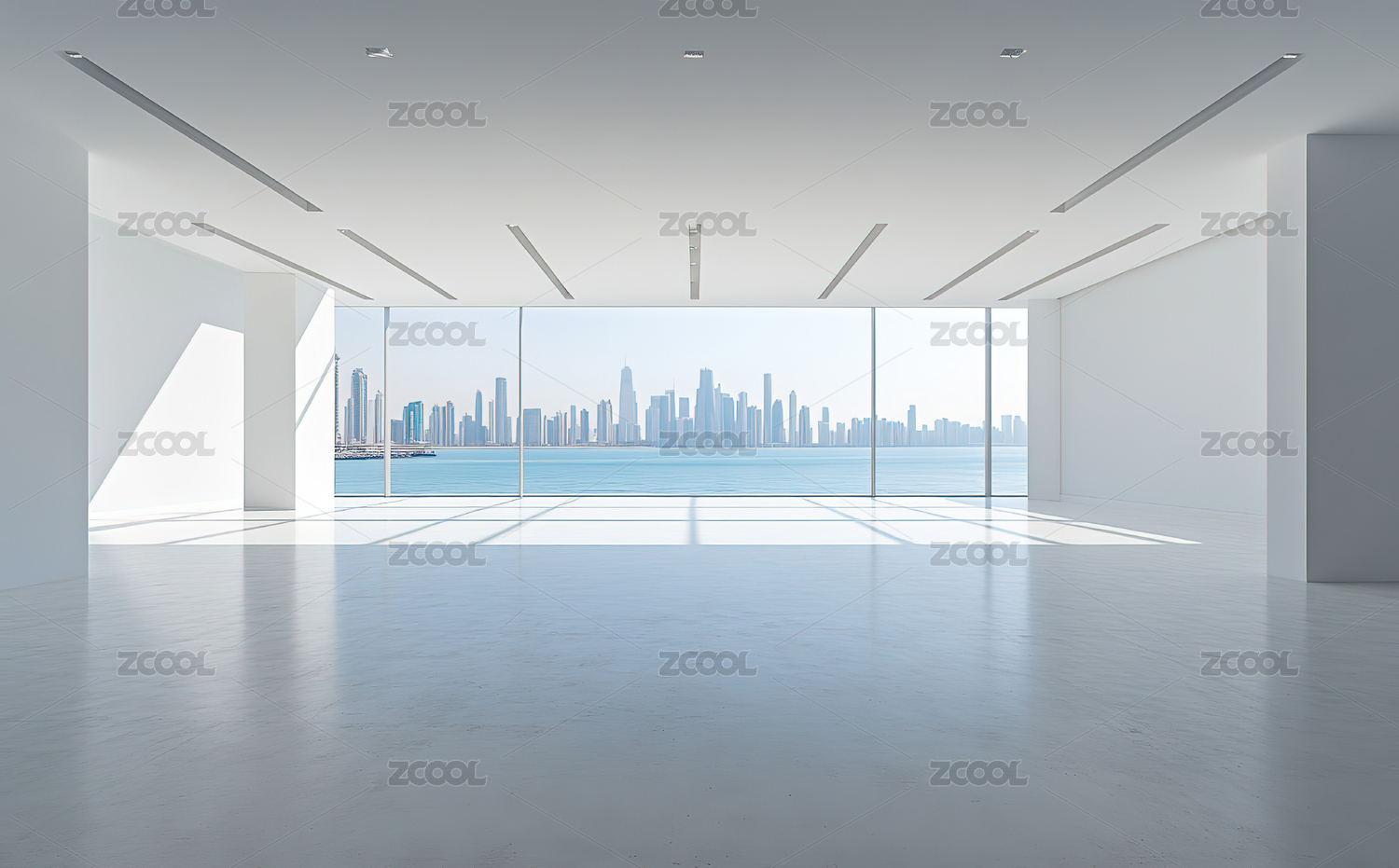 空旷的室内空间与窗外的城市建筑群