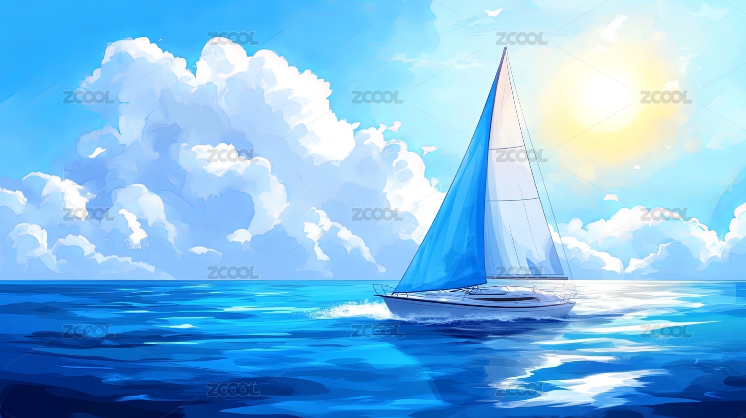 蓝色帆船海上航行数字插画