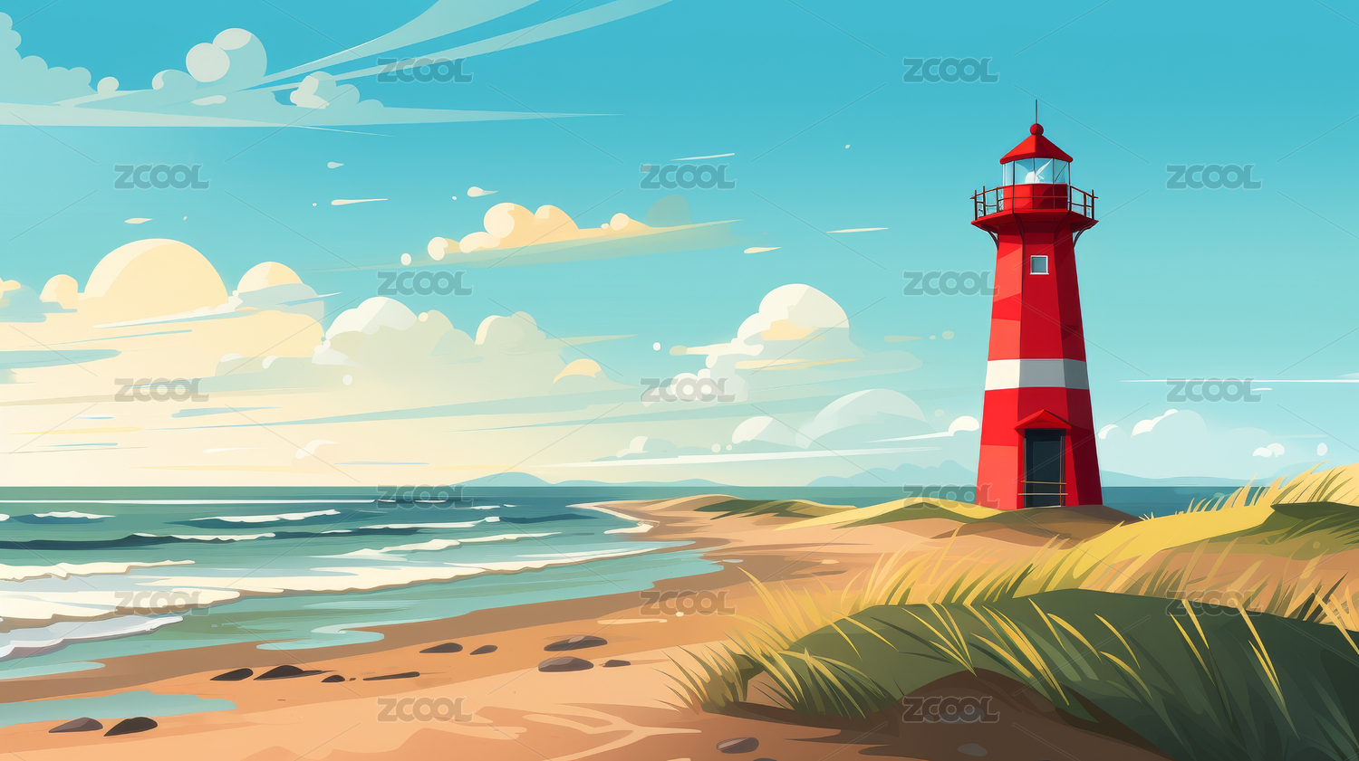 无人,灯塔,海岸线,塔,海洋,插画,房屋,自然,海滩,景象