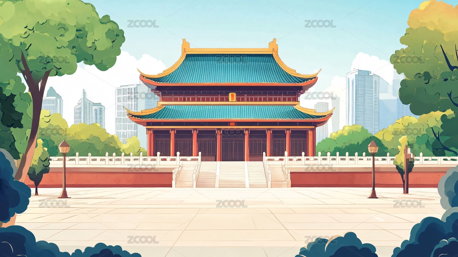 城市地标建筑插画背景图