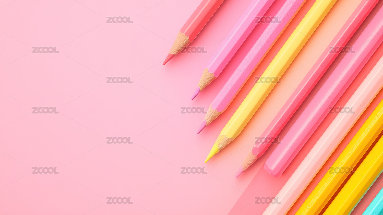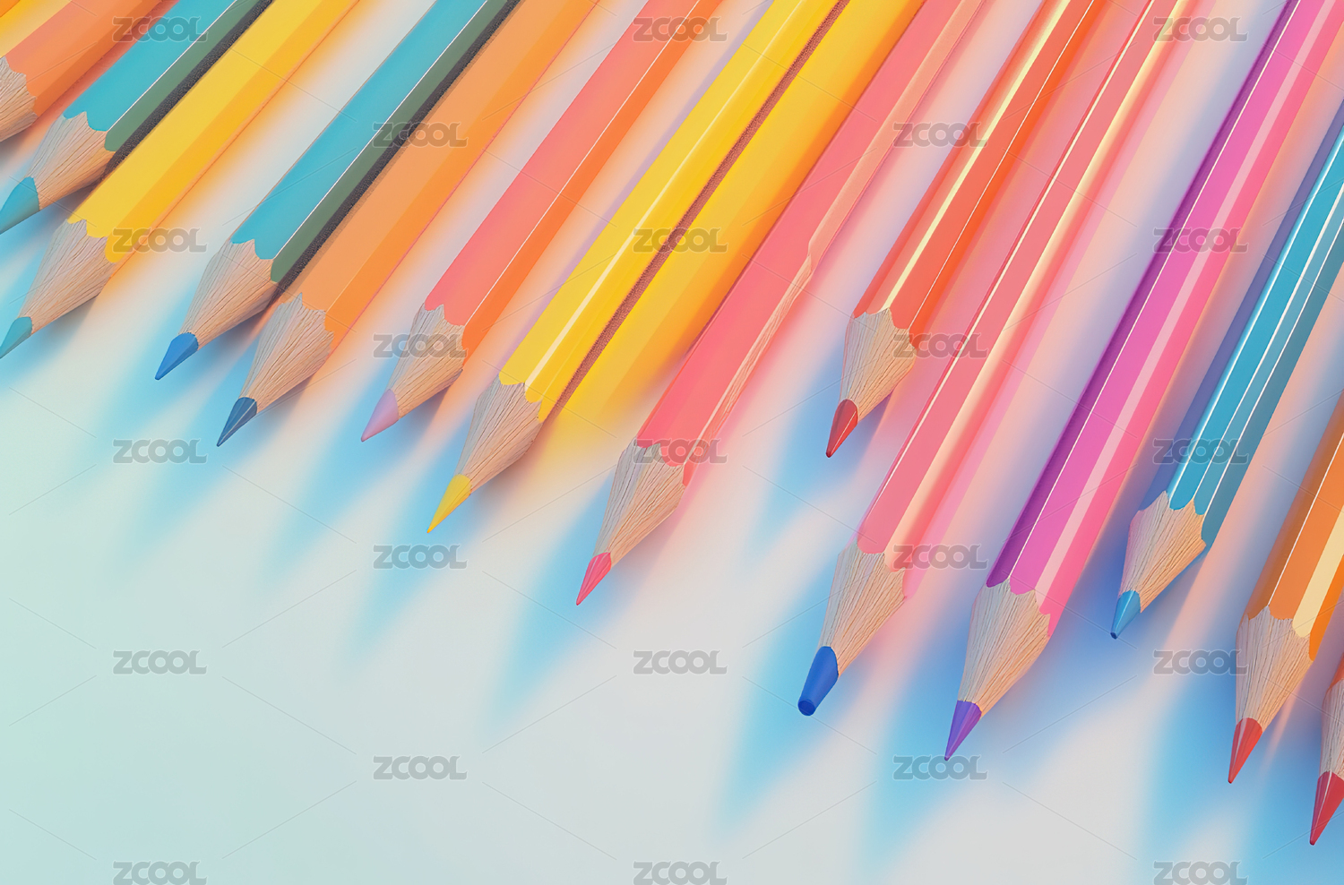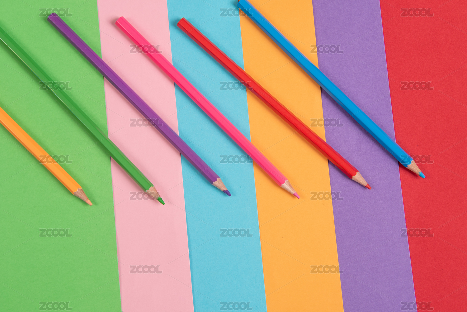 彩色背景下五颜六色的彩色铅笔,创意摆拍