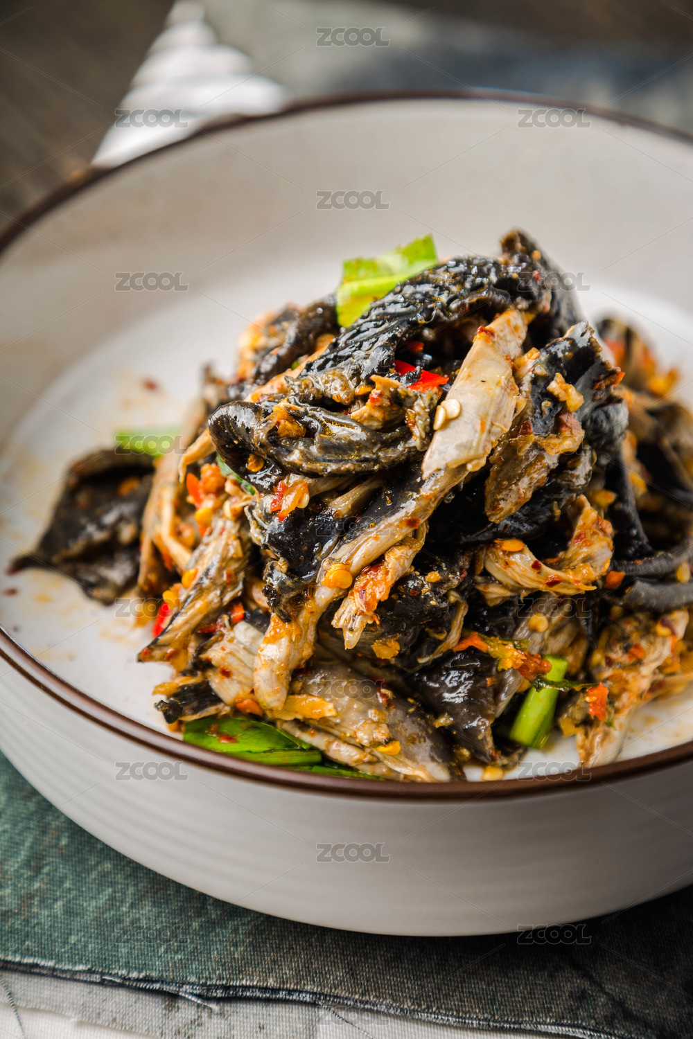 棕色木纹桌上放着一盘凉拌乌鸡脚