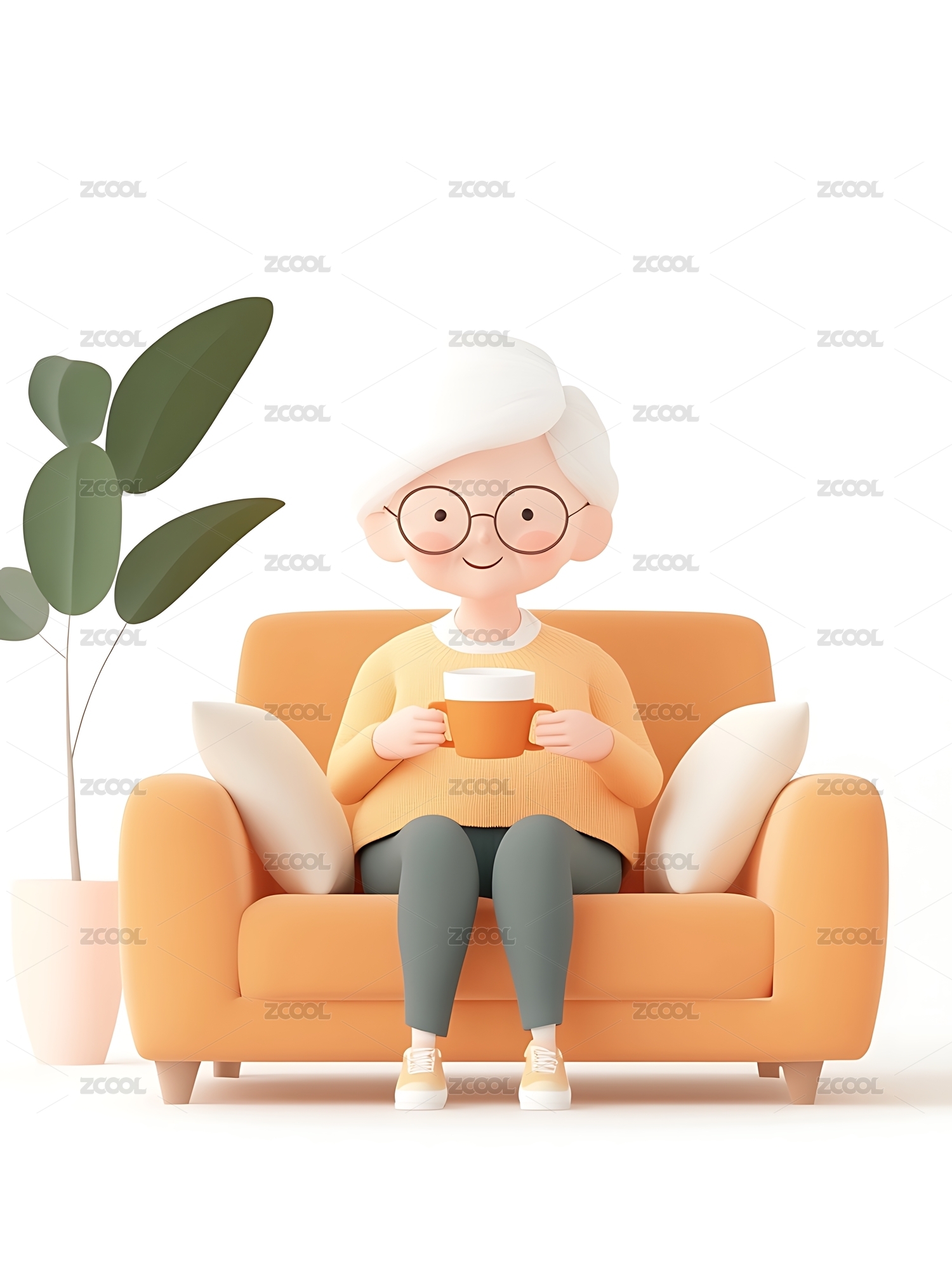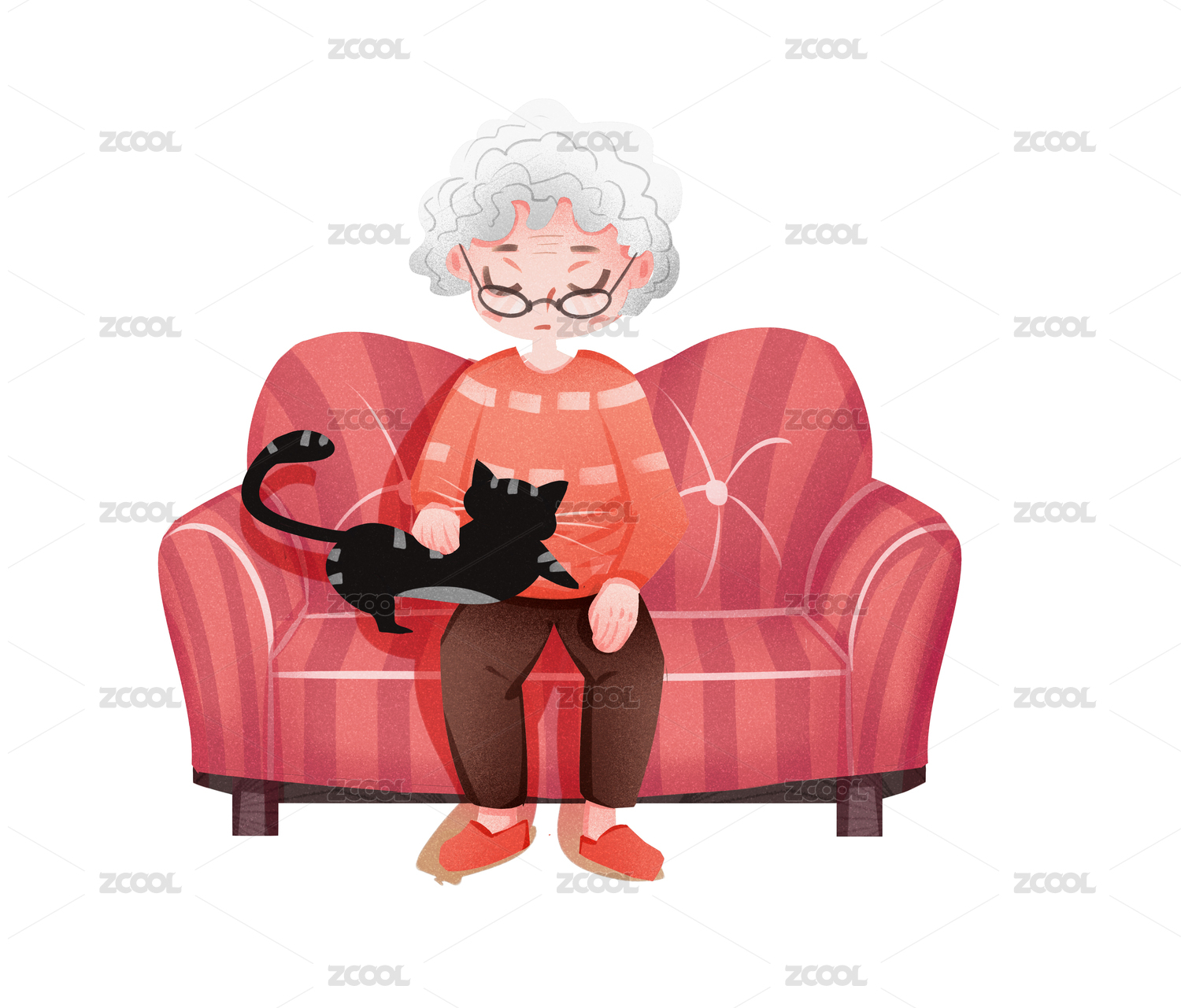 老奶奶抱着猫孤独的坐在沙发上 可爱风格独居老人社会现象插画