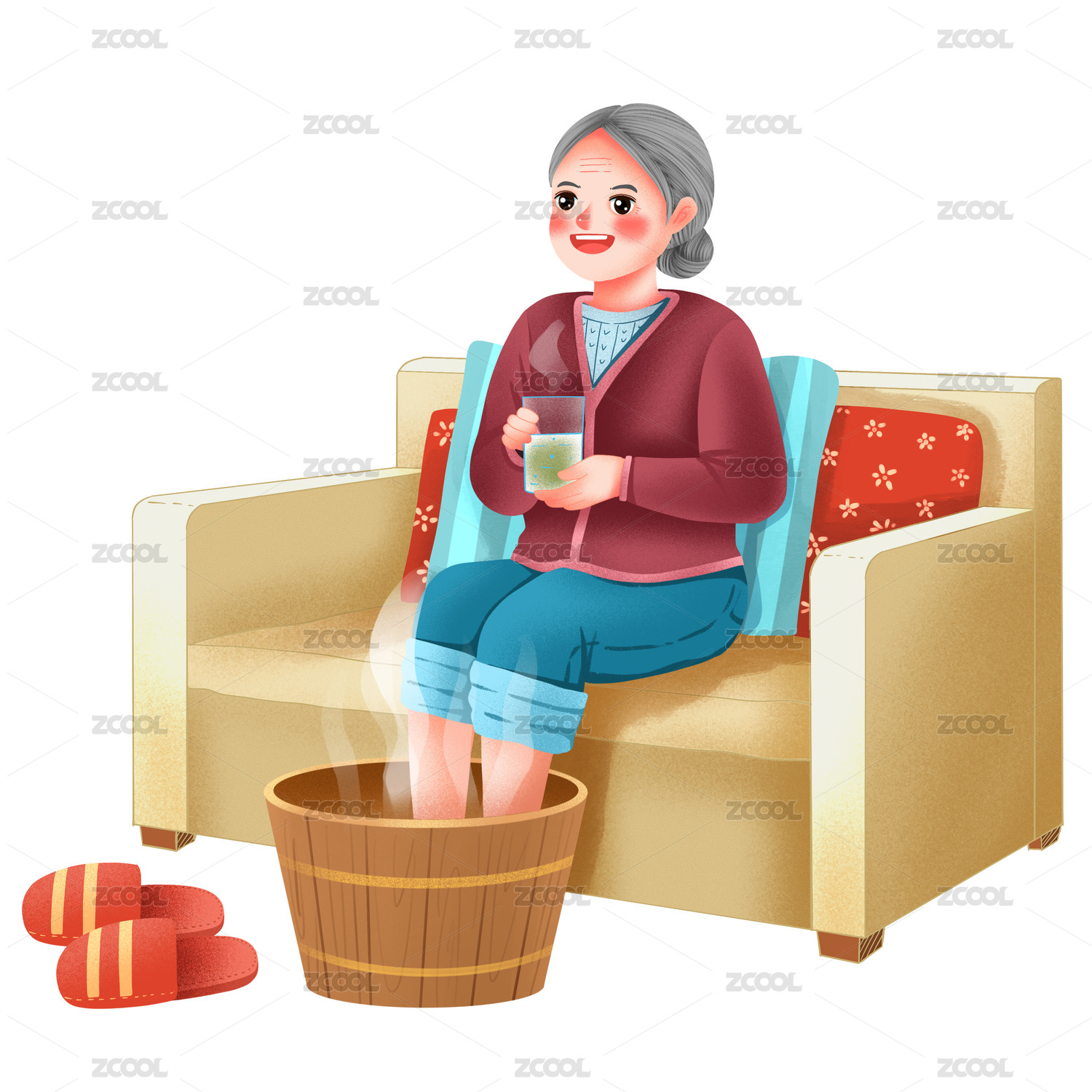 孙女在家中给奶奶端水 可爱风格重阳节孝敬老人插画