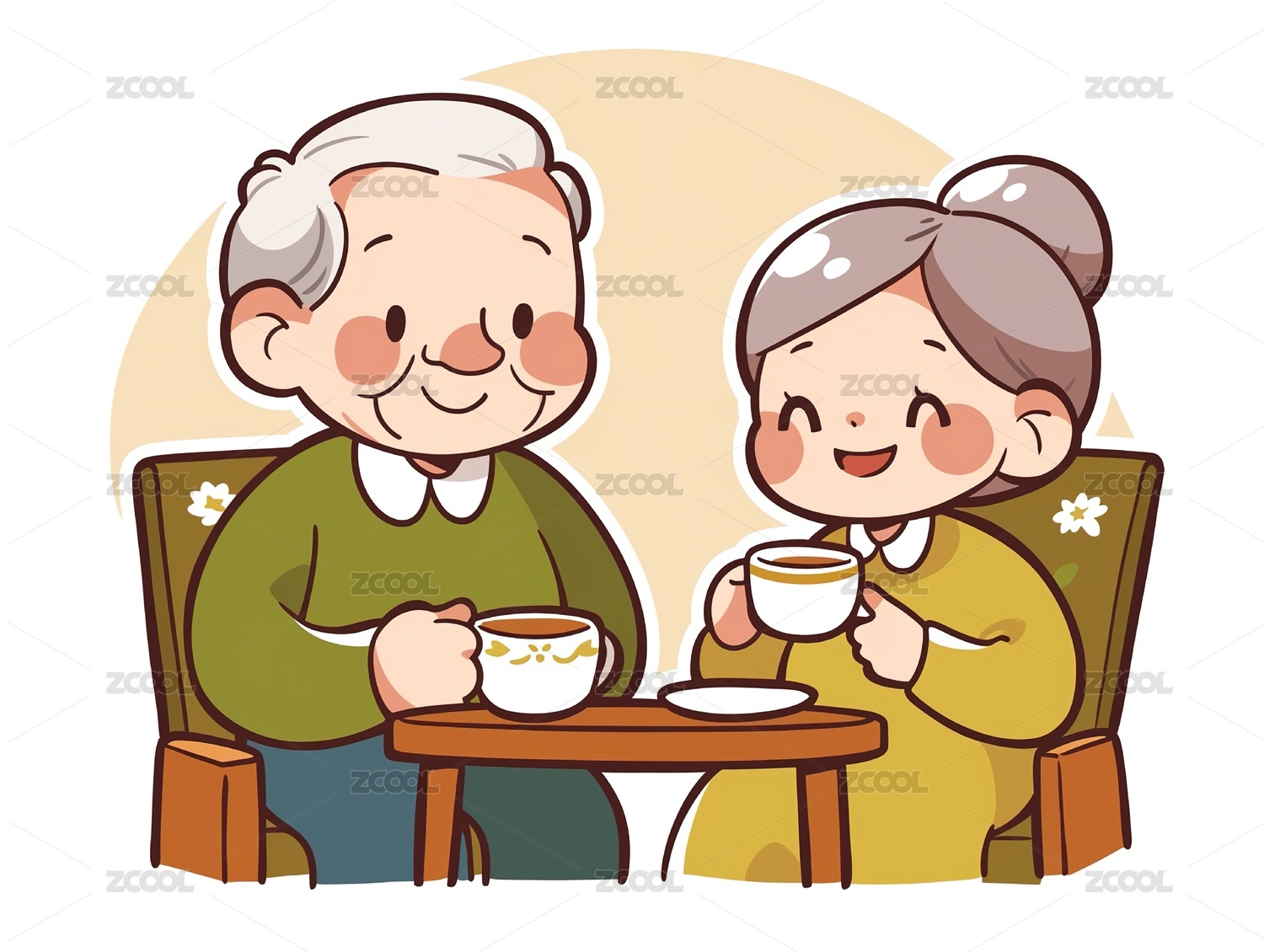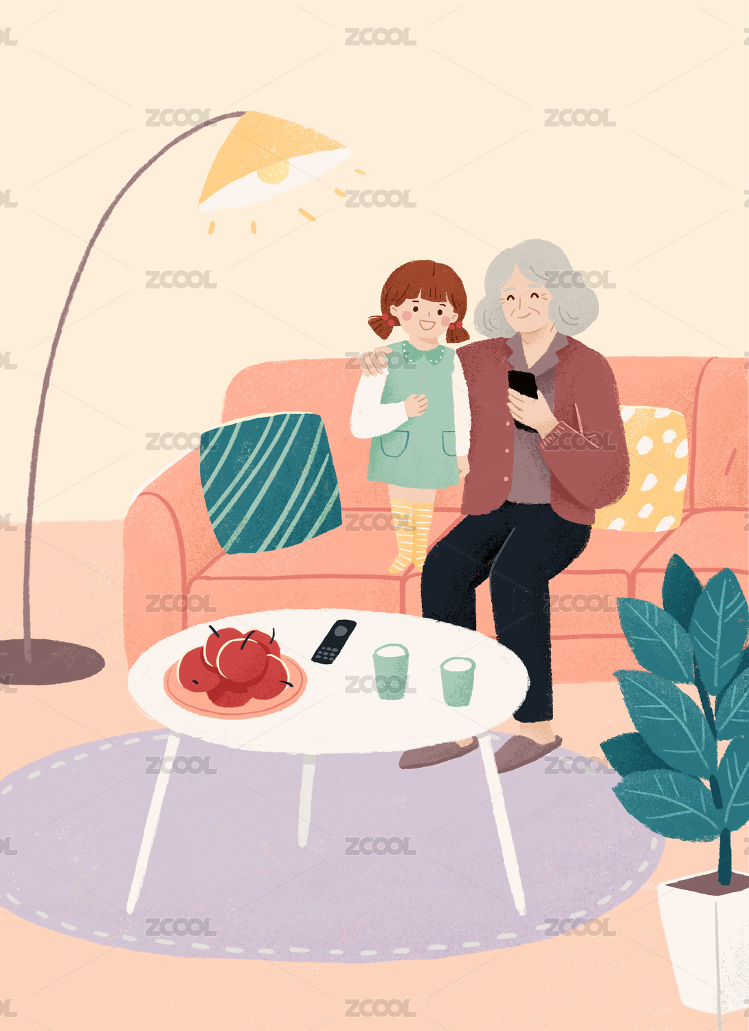 孙女,家中,奶奶,端水,端茶递水,可爱风格,重阳节,孝敬老人,插画,喝水