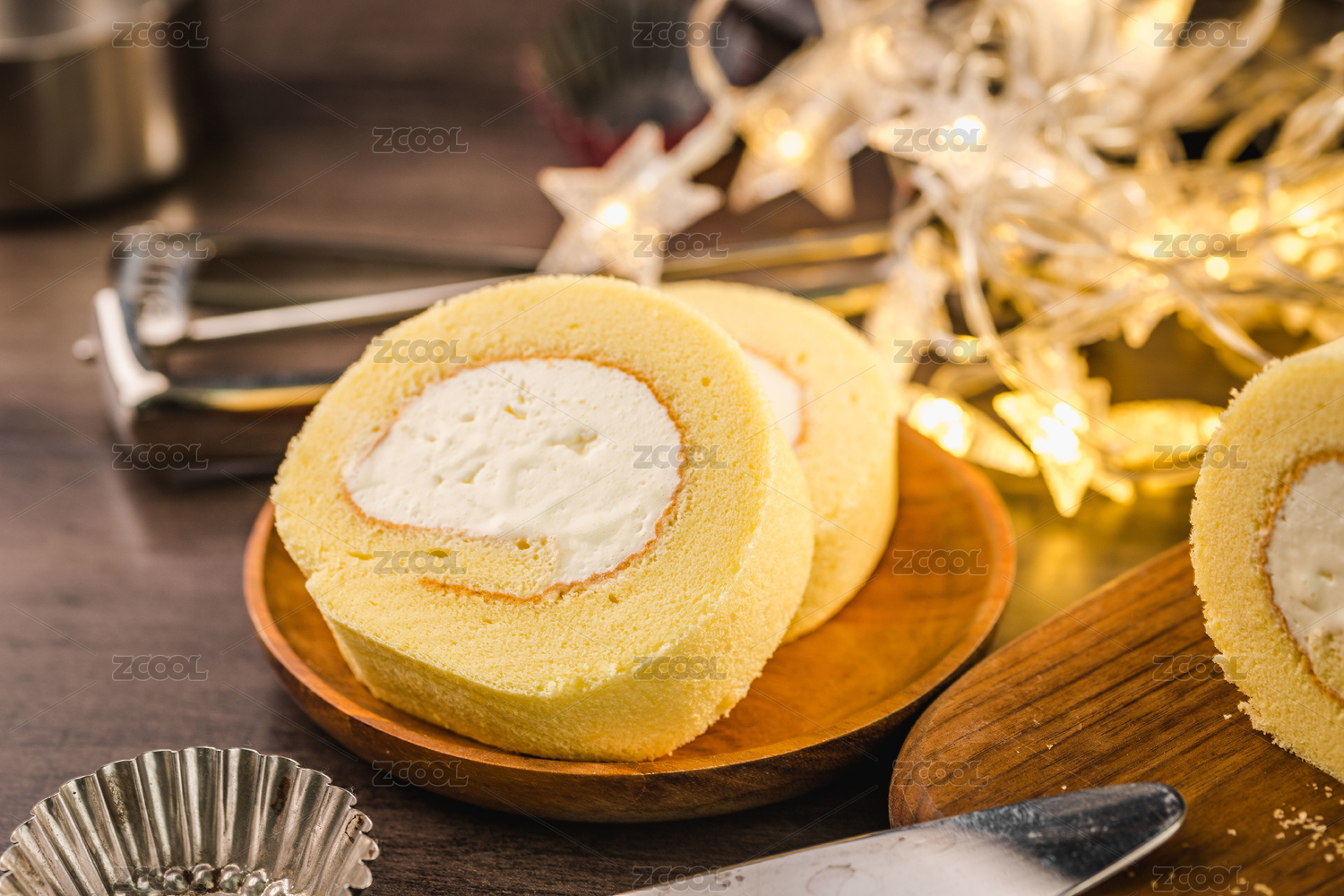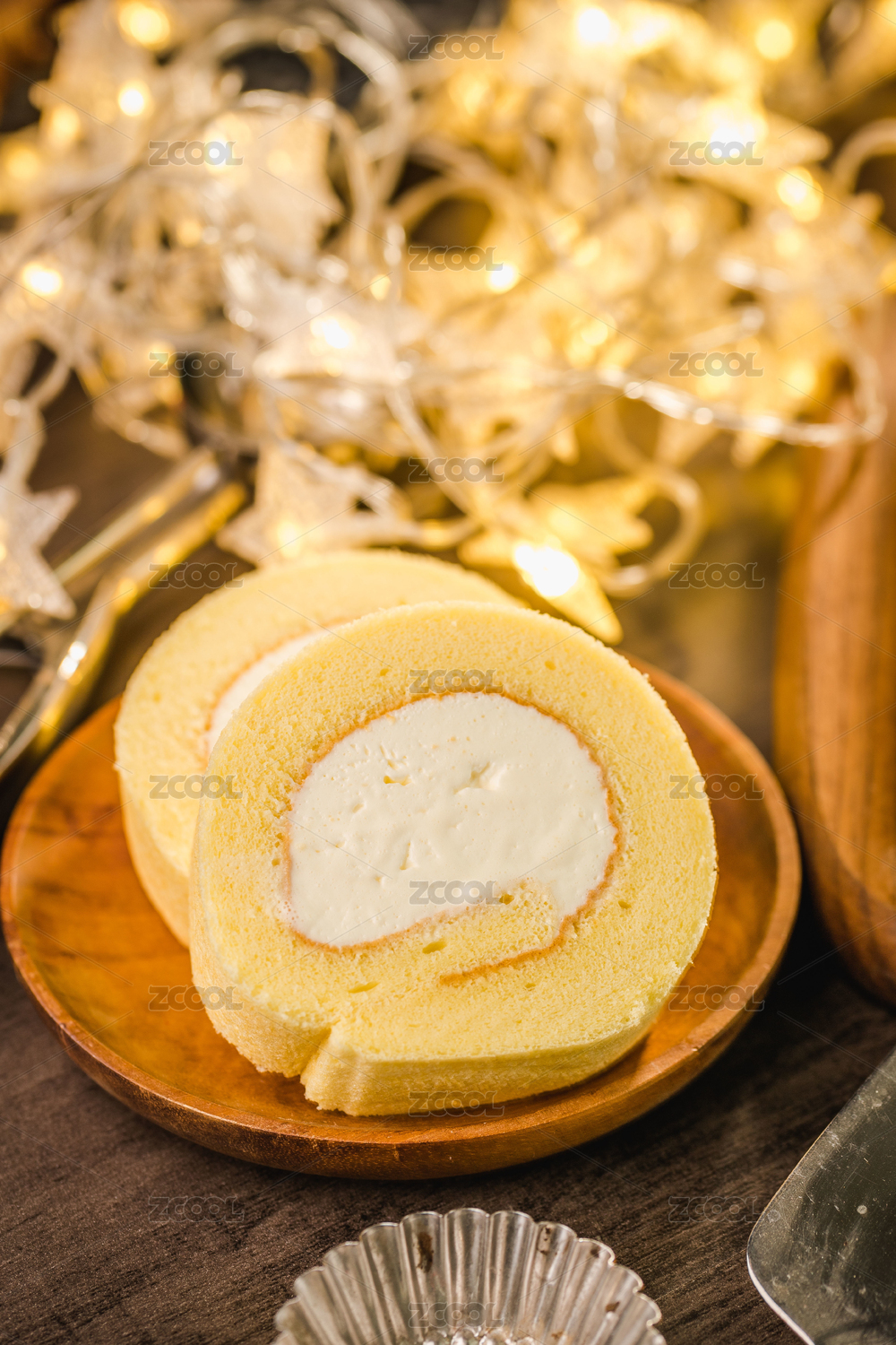 棕色桌面上放着一份奶油夹心蛋糕卷
