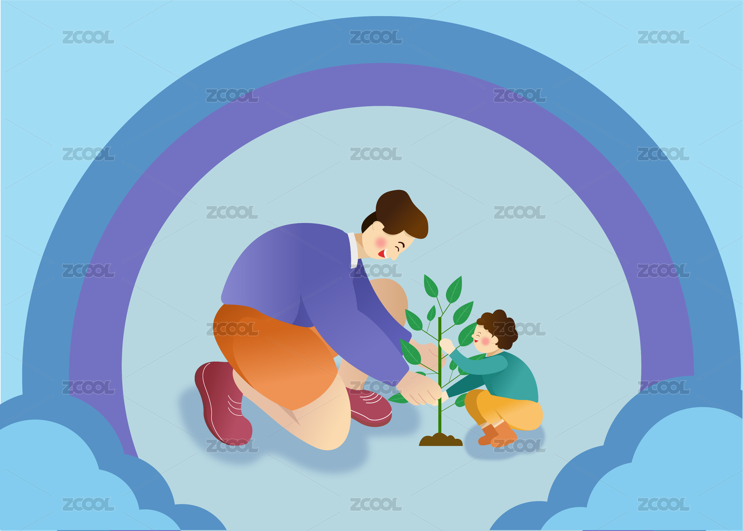 父亲节矢量插画 父子一起种植小树