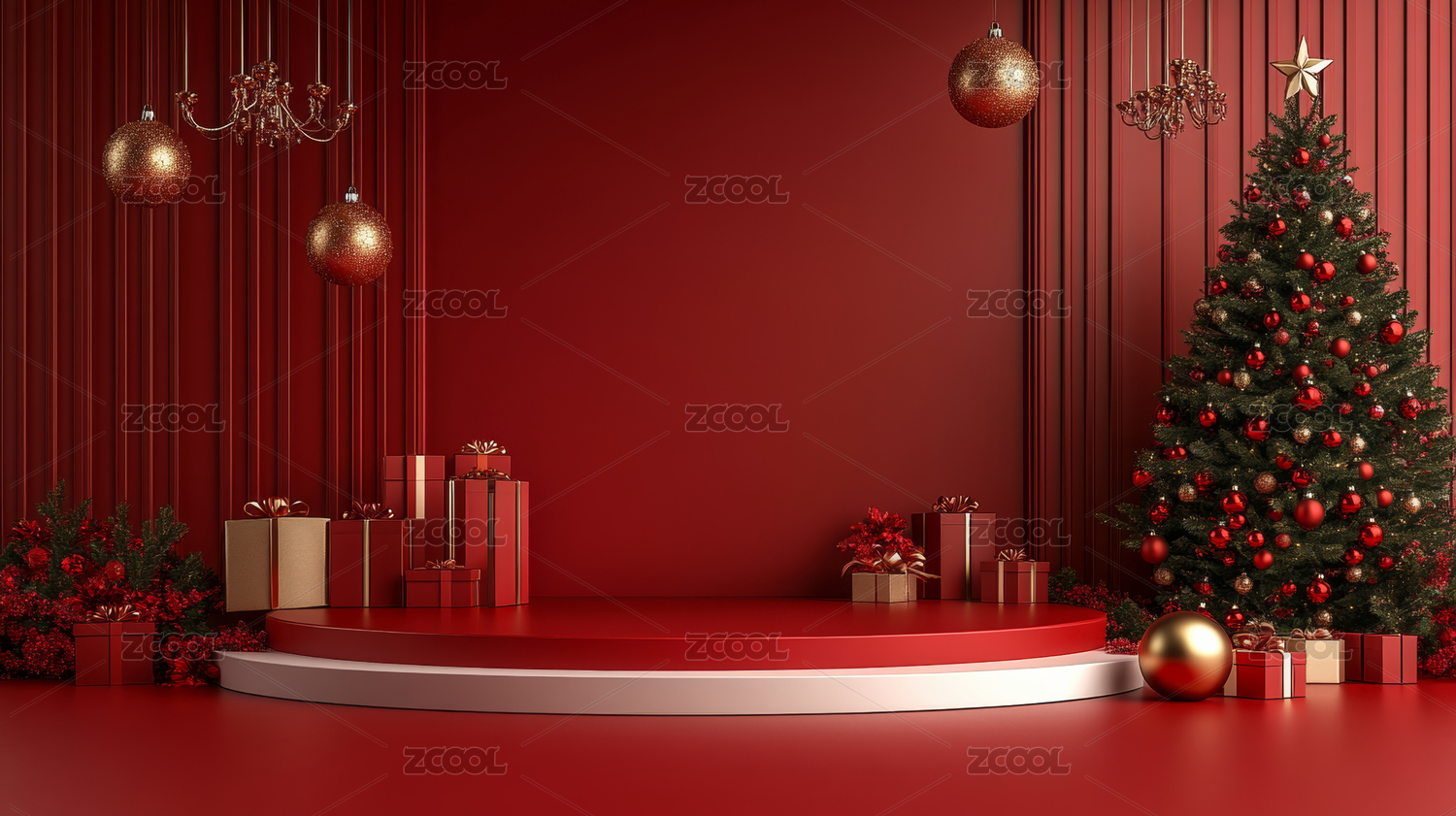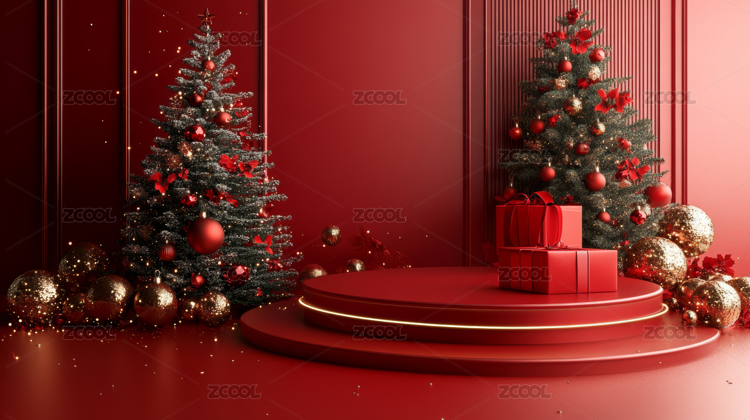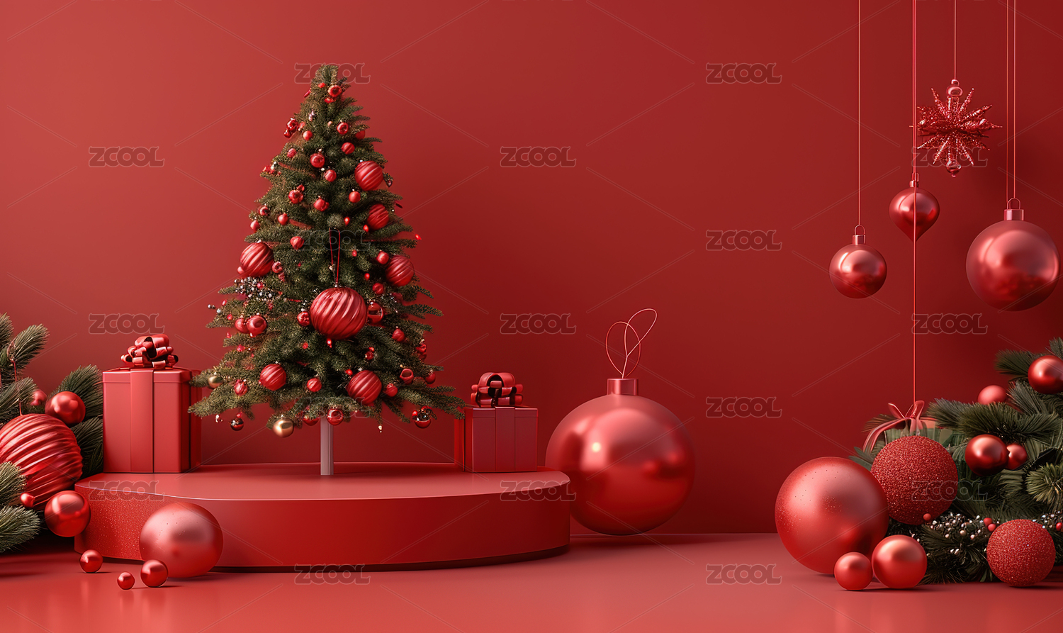 3D渲染红色圣诞节主题电商产品展台背景