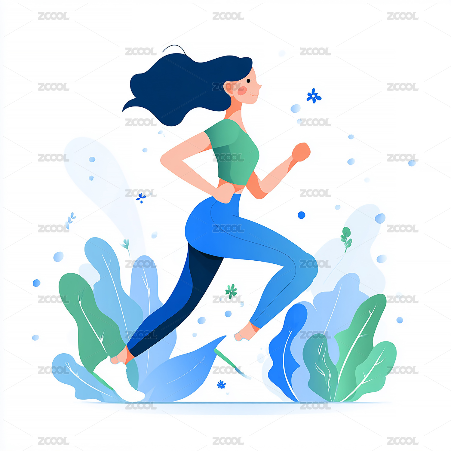 一个健美女性在花草丛间轻盈的跑步做健身运动--扁平化插画