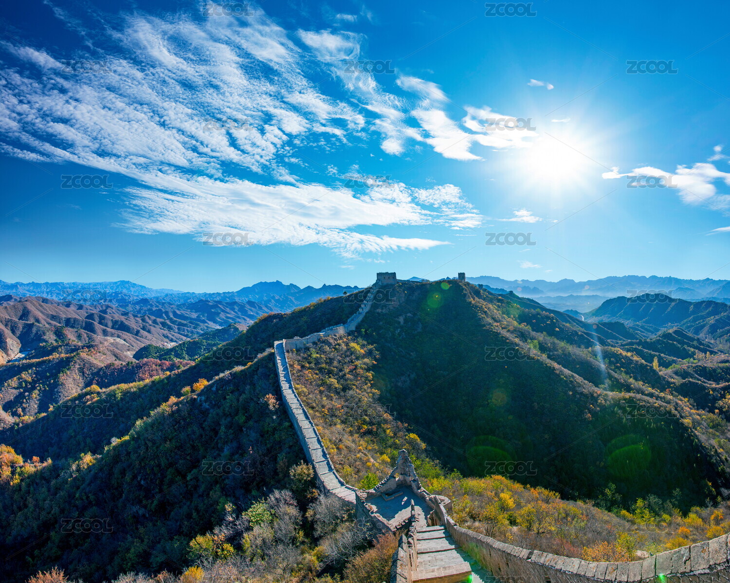蓝天白云下的中国长城蜿蜒盘旋丛山峻岭