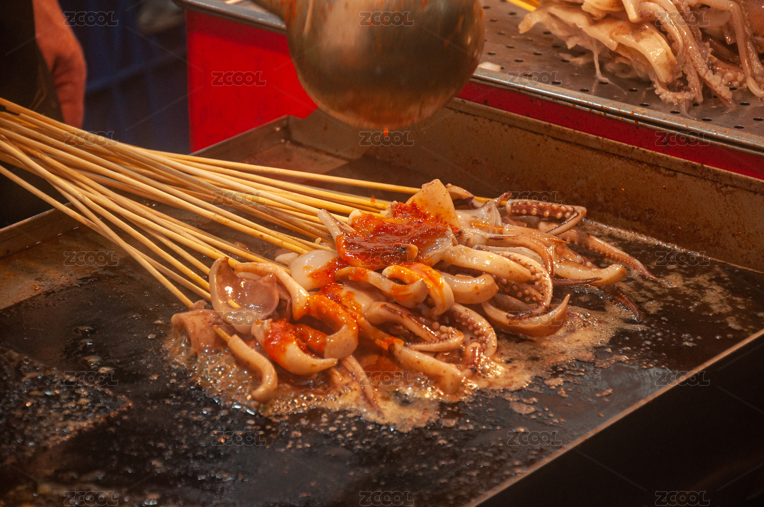 正在烤制的铁板鱿鱼铁板鱿鱼须特写