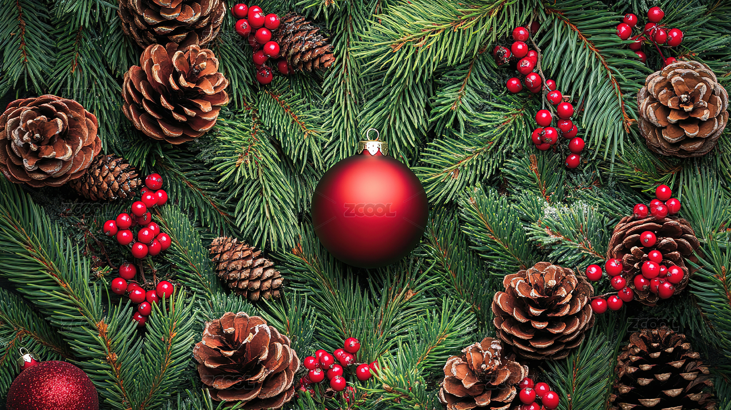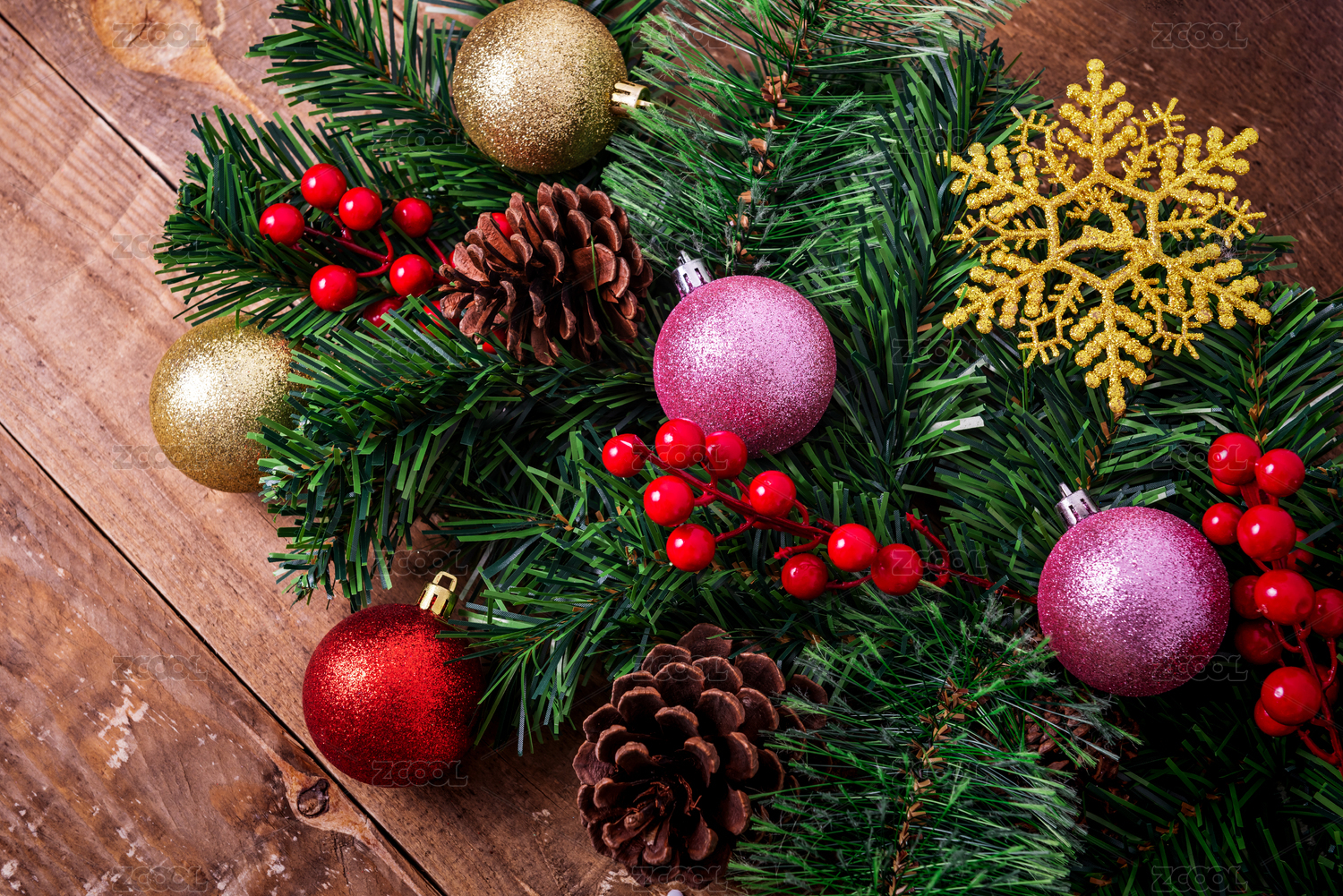 圣诞节装饰品背景,圣诞树,圣诞球,浆果和雪花在桌子上