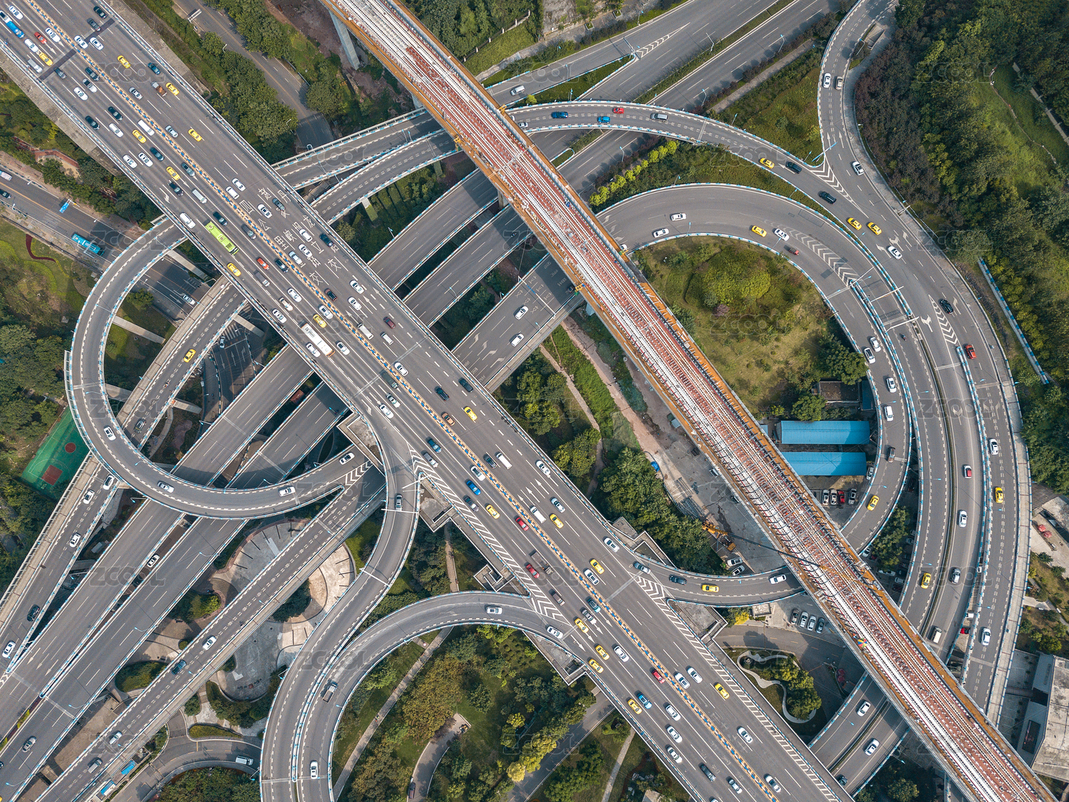 傍晚俯拍中国四川省成都市十陵立交桥。