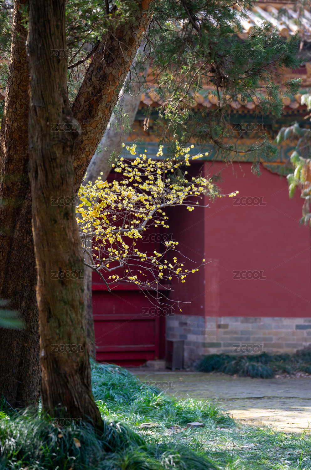 冬天中国南京明孝陵的红墙与盛开的腊梅