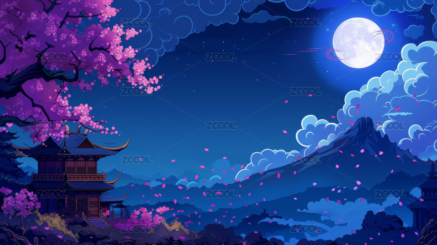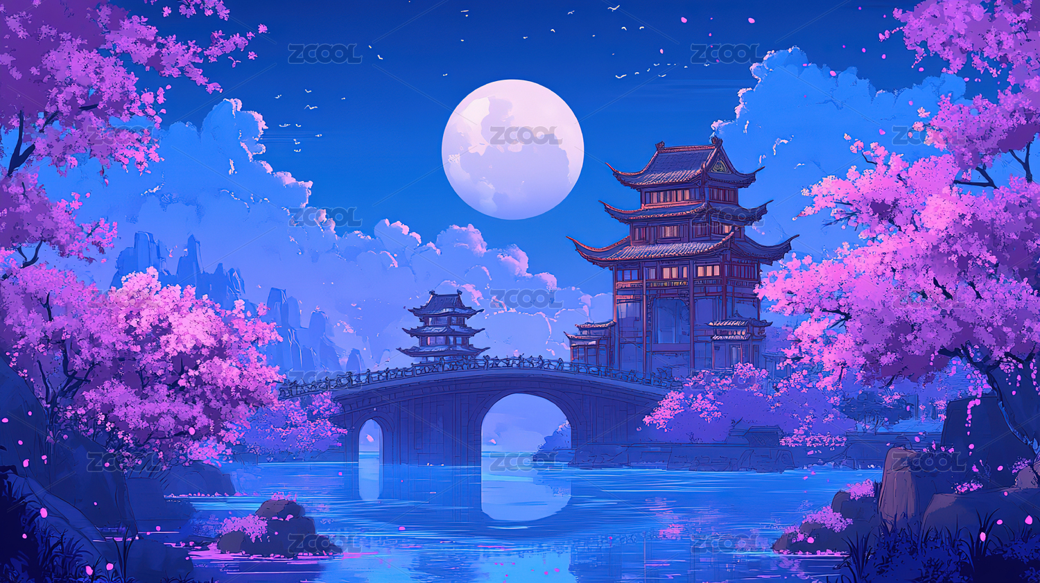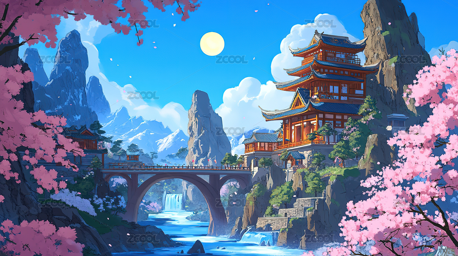 宁静诗意古风桃花古建筑插画