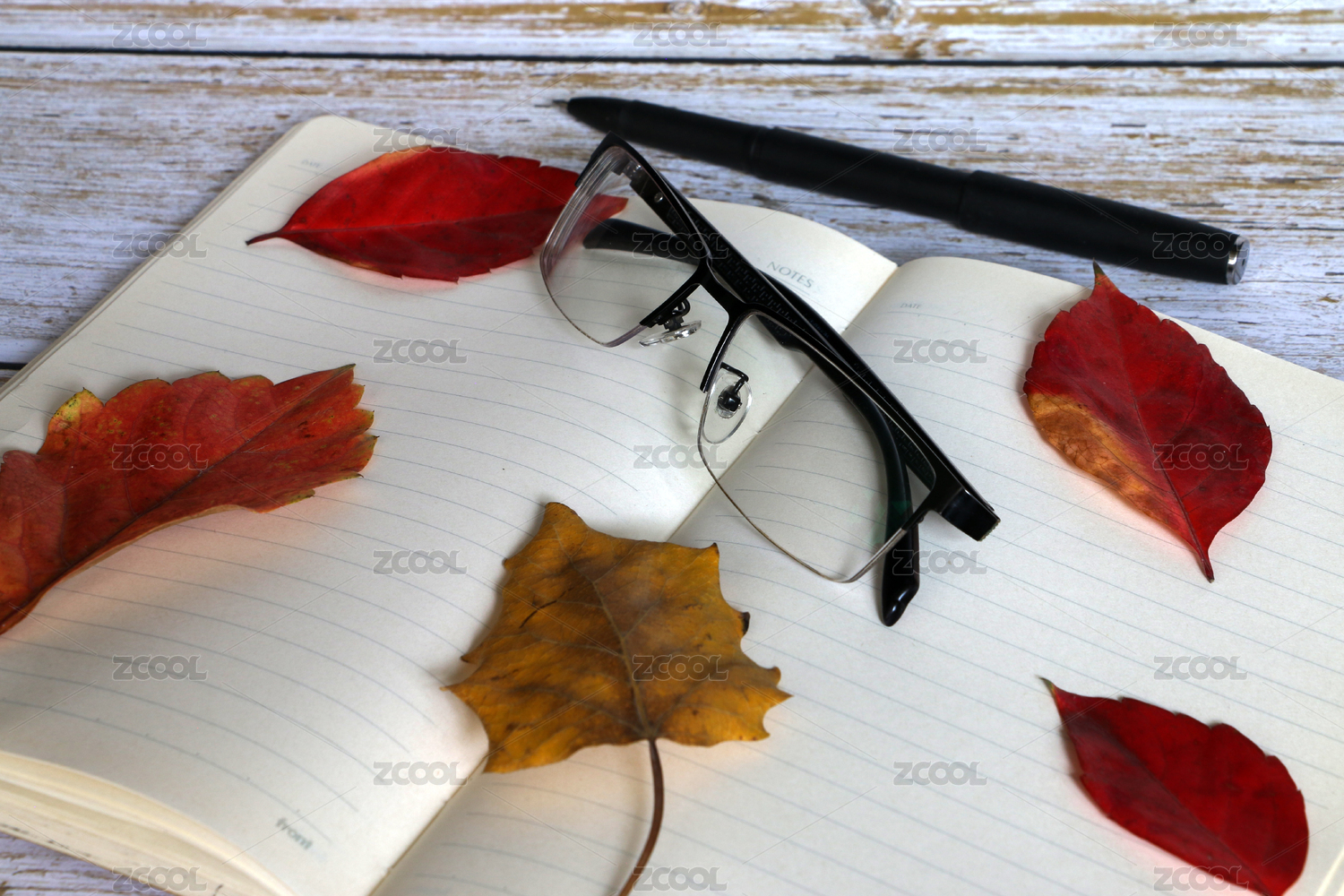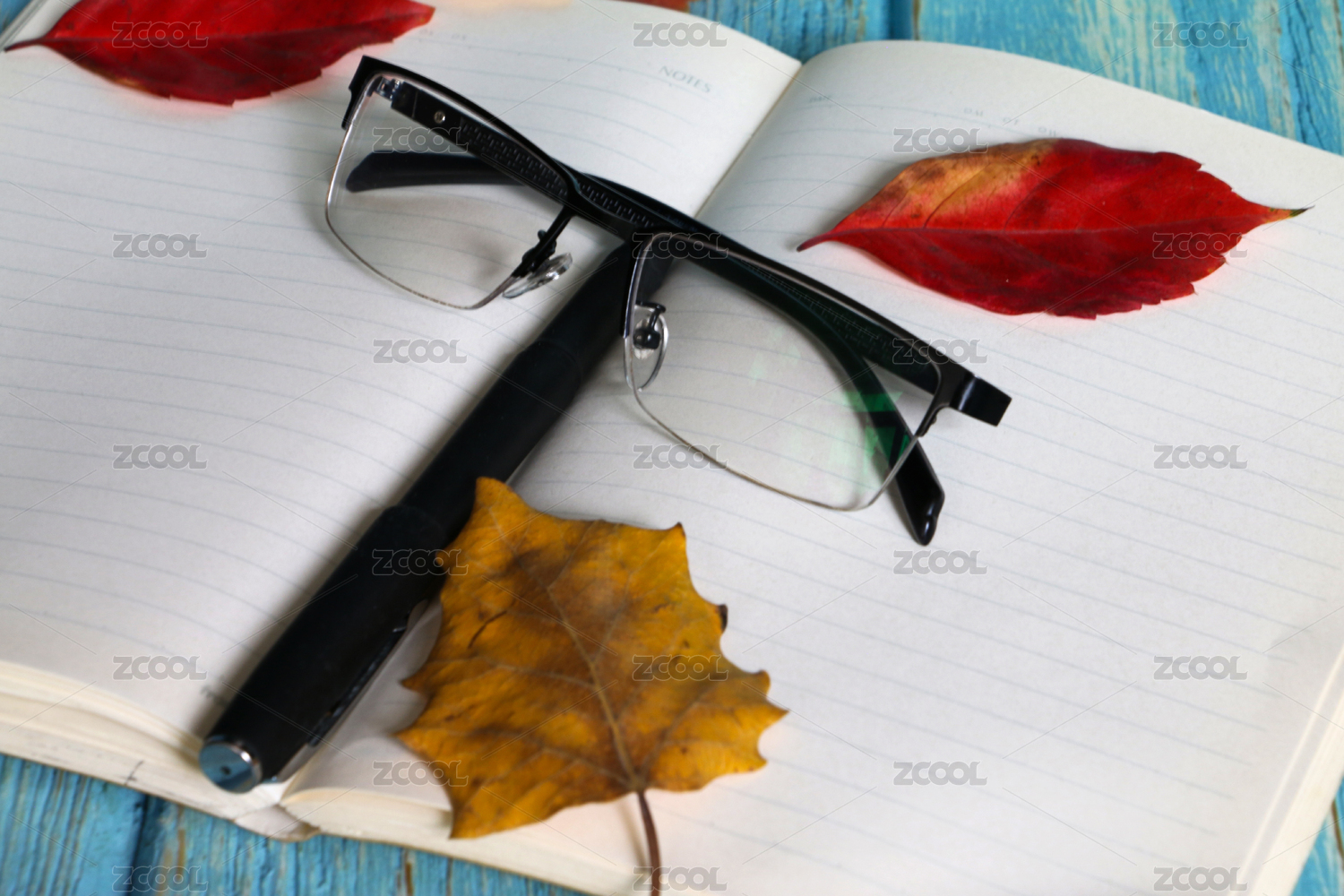 笔记本,眼镜,红叶,叶子,笔,本子,叶片,枯叶,落叶,木质