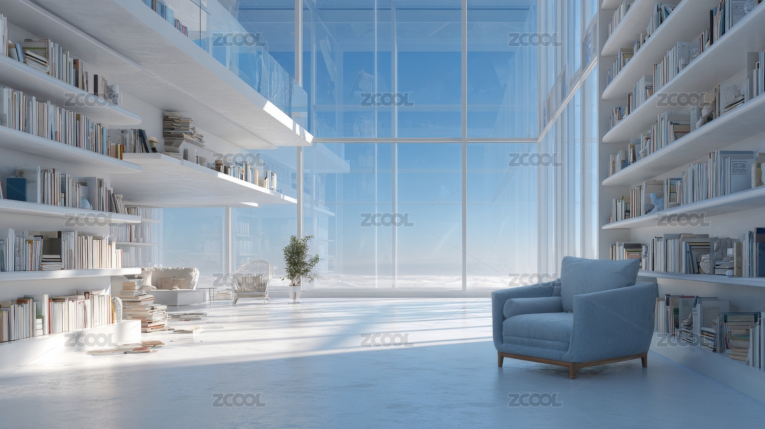 极简室内设计中的大型木质书架摆满书籍