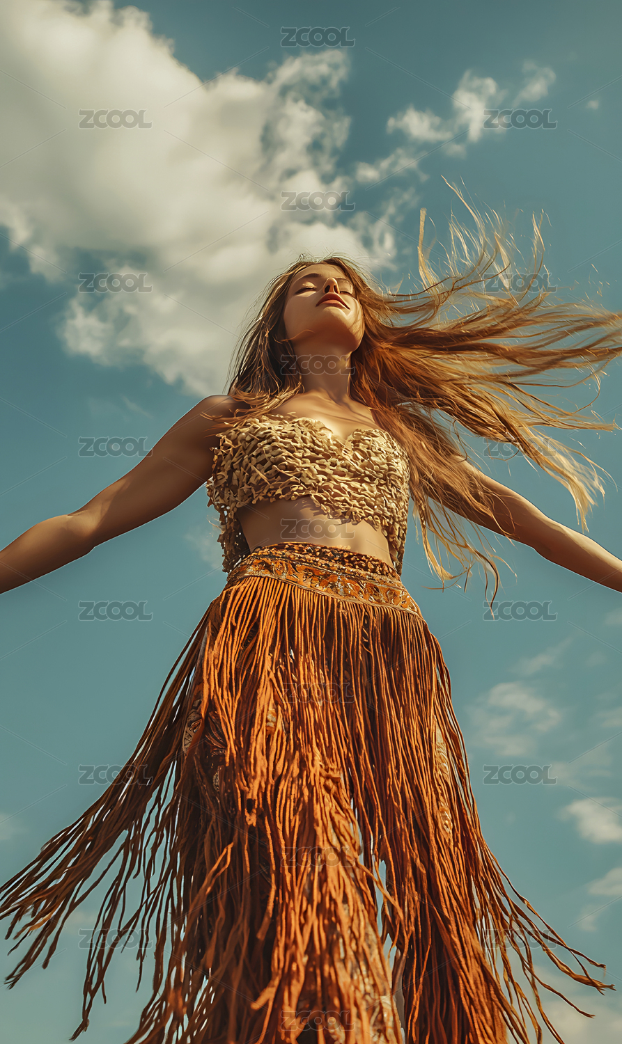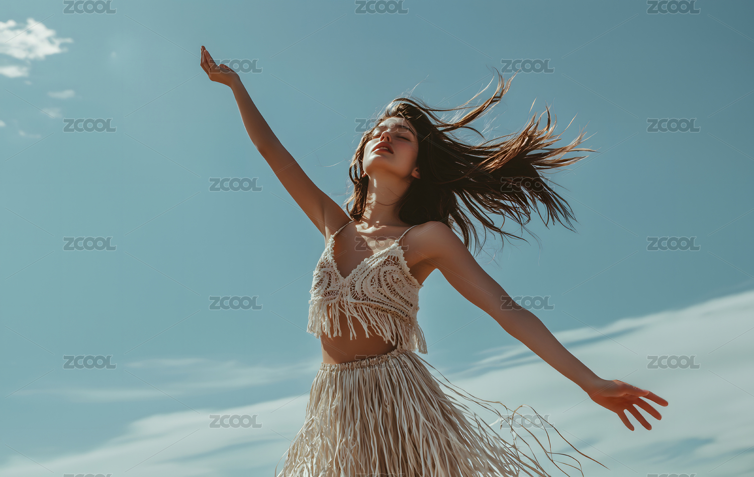 DXCZ202406,阳光,轻松,年轻女性,裙摆,迷人,波西米亚流苏裙,蓝天背景,敞开双臂,飘扬头发