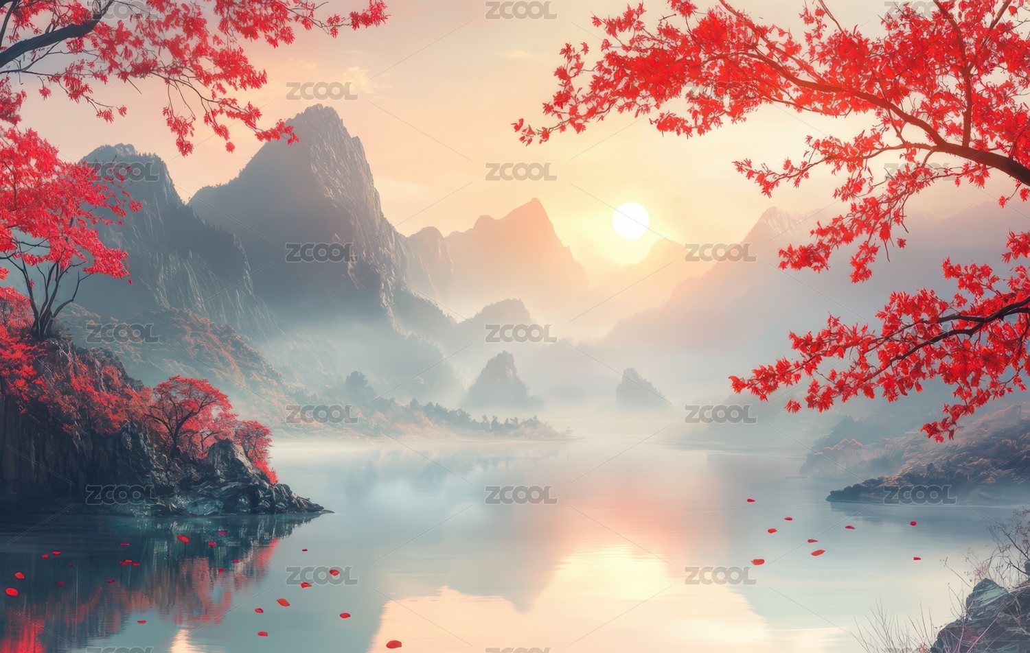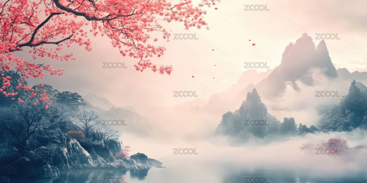 中国元素,中国文化,传统,古典,山水画,国风,极简,山岳,湖,船