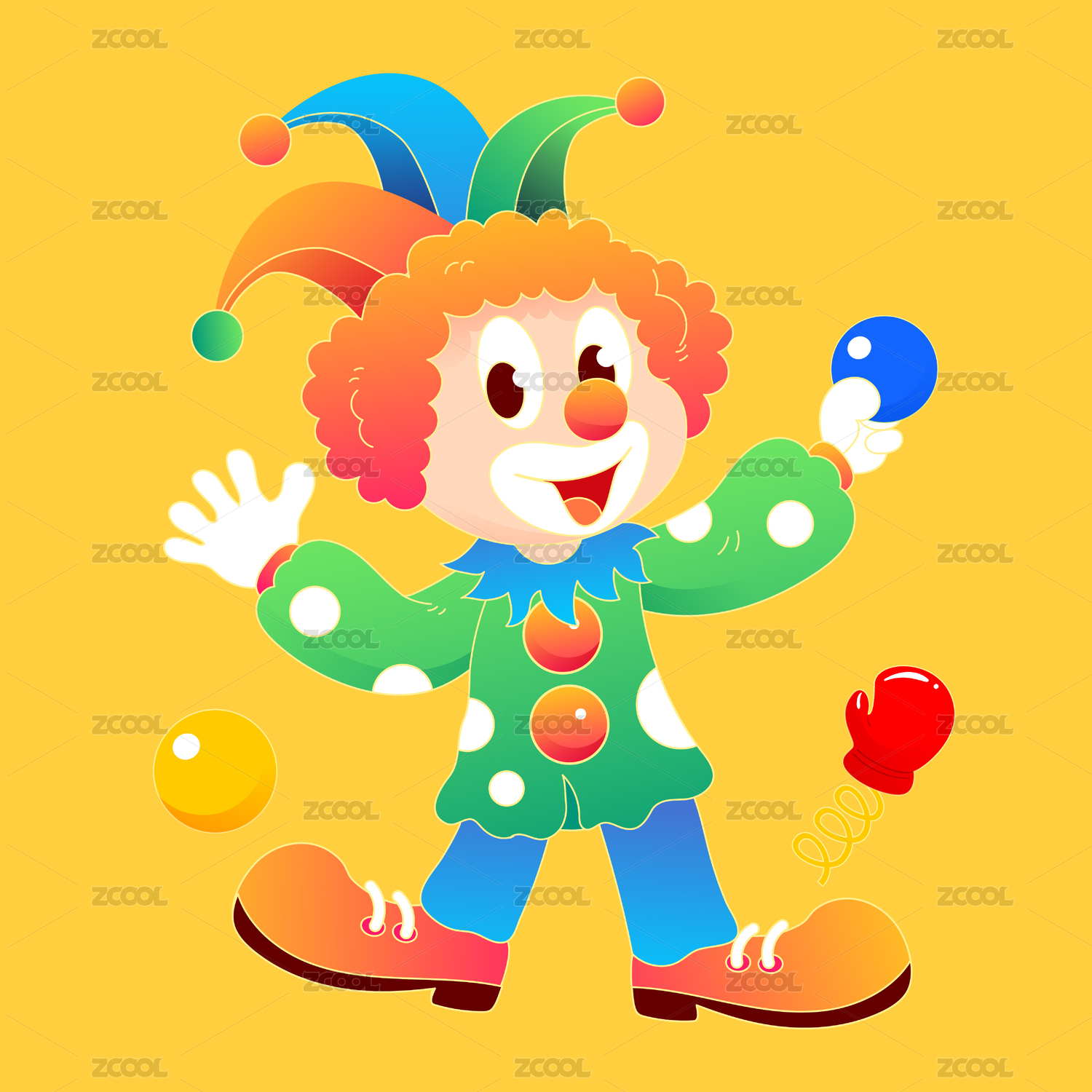 红色杂耍抛球小丑表演卡通矢量图