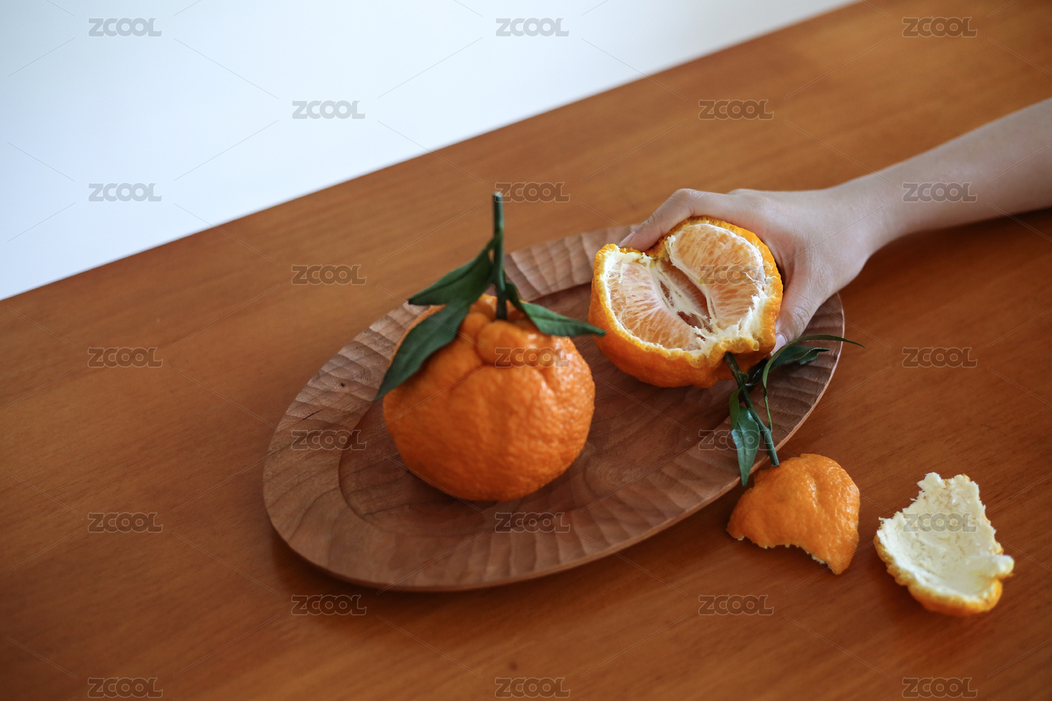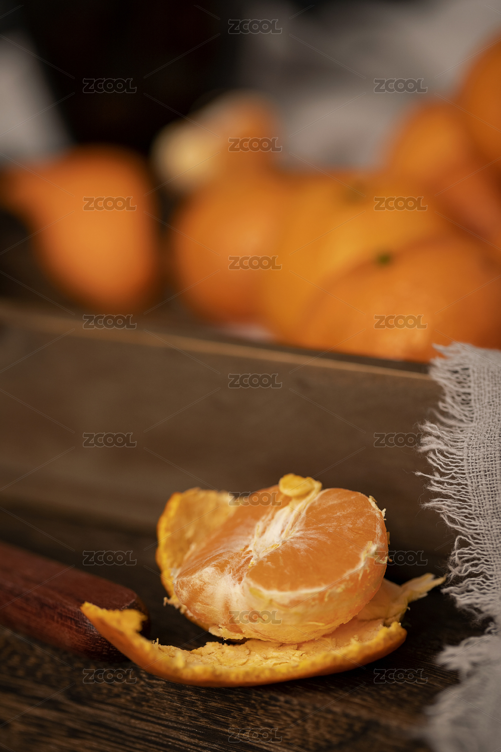 原色木板上散放着刚采摘的橘子拨开露出橘瓣