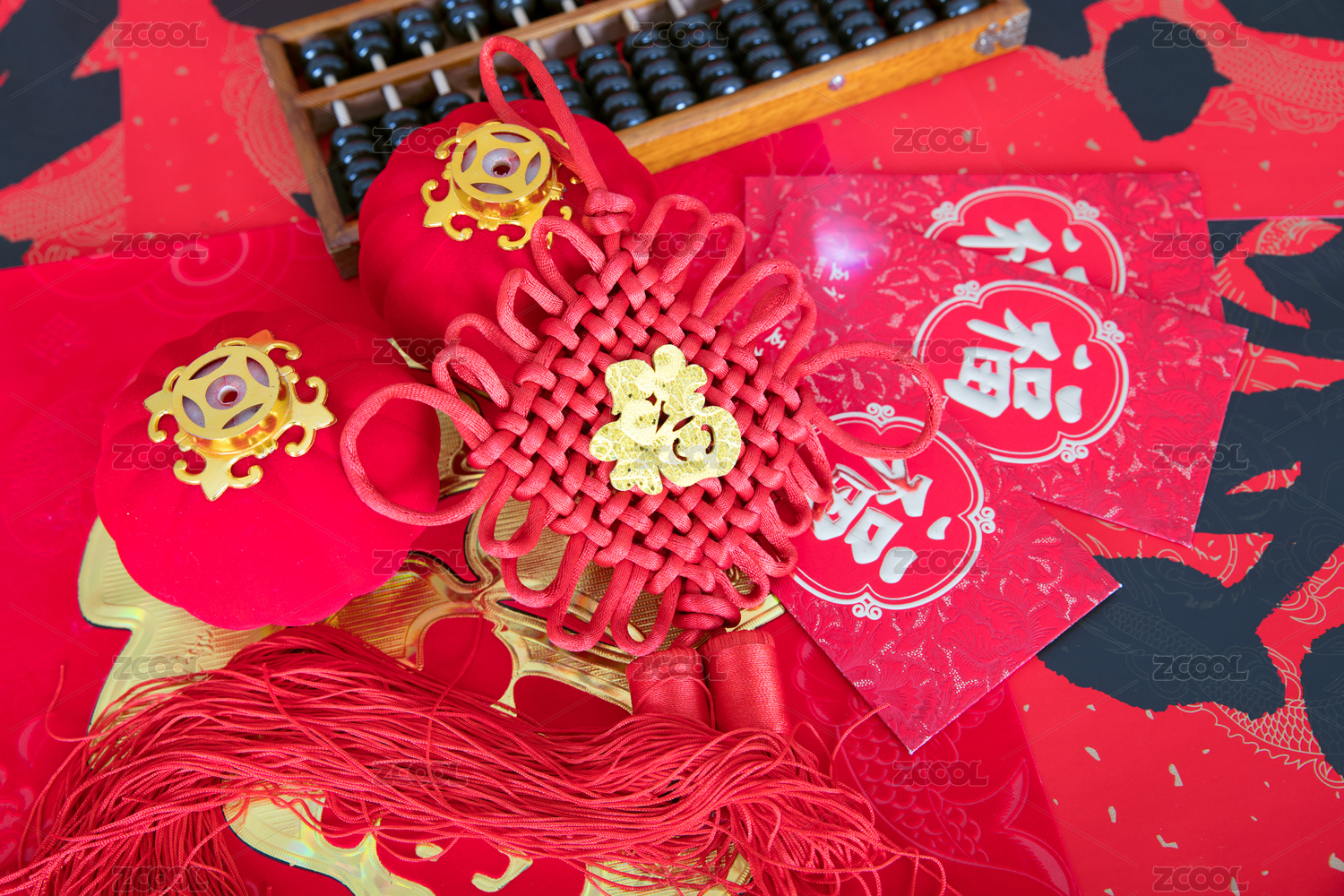 俯视桌子上的中国结和红包及算盘和小灯笼